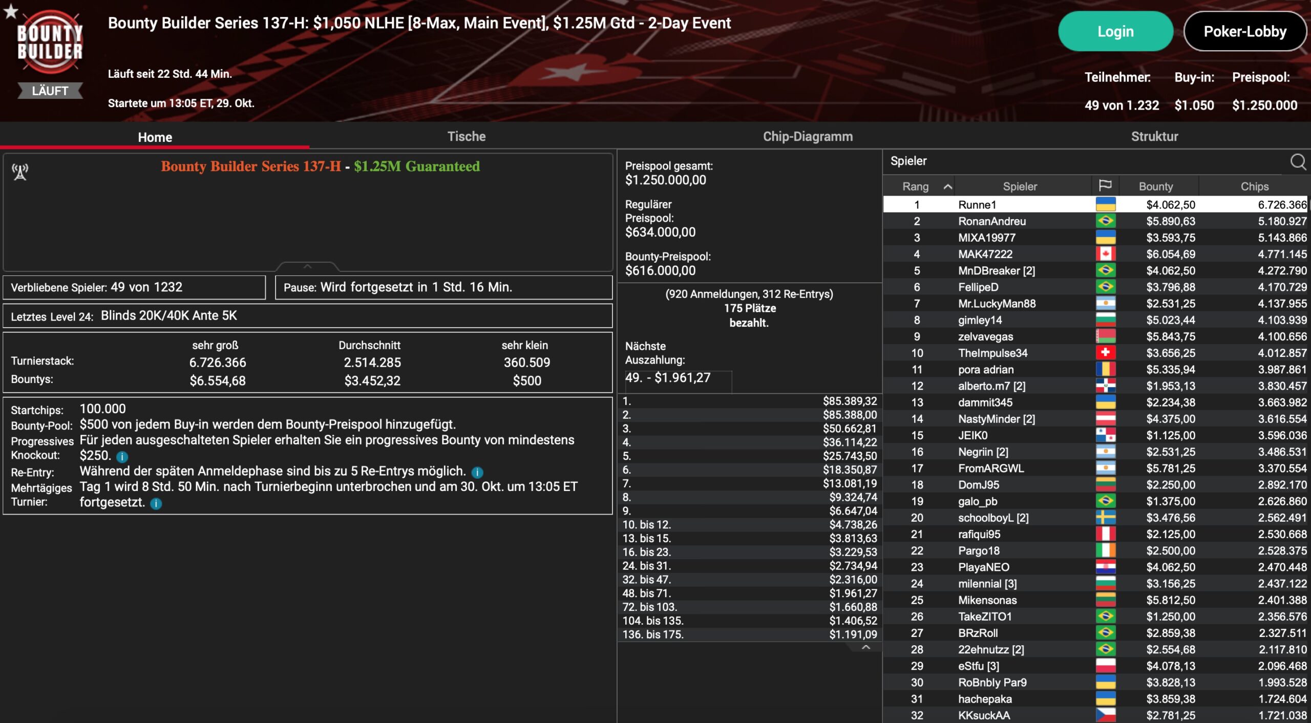 Die Bounty Builder Series hat für viel Action auf PokerStars gesorgt. Am Sonntag wurden die letzten der 144 Events gespielt und das $1.050 2-Day-Main Event gestartet. Auch das $5.200 Titan’s Event und die Special Edition der $109 Sunday Million gehören natürlich zu jedem Sunday Grind. – Die großen Erfolge für die D-A-CH-Community blieben in den Hauptturnieren (noch) aus, abgesehen von einem BBS-Titelgewinn von „ShampoIsBetta“ aus der Schweiz. Daneben konnte Patrick „JaegsPL“ gleich zwei der regulären MTTs mit dreistelligem Buy-In shippen.