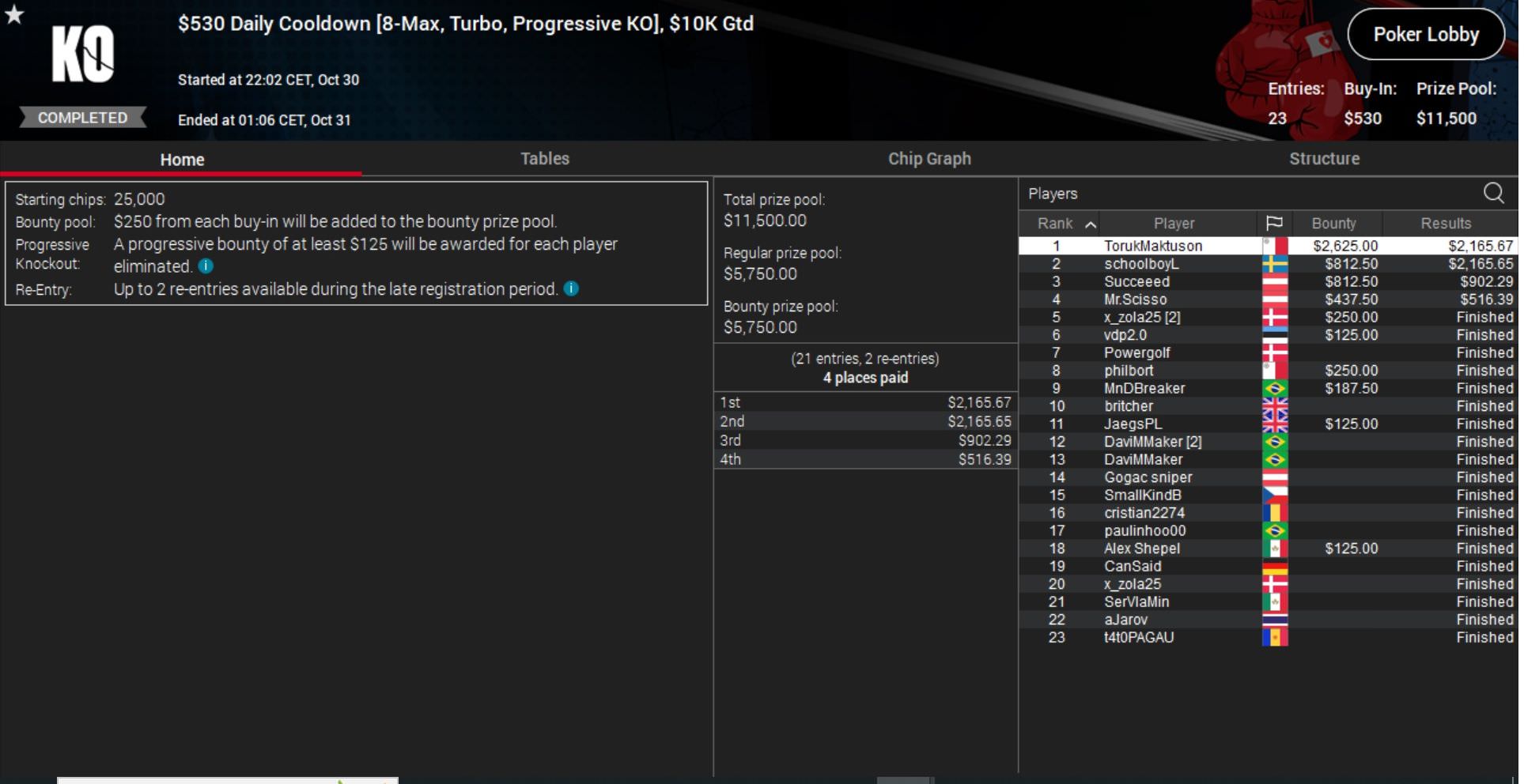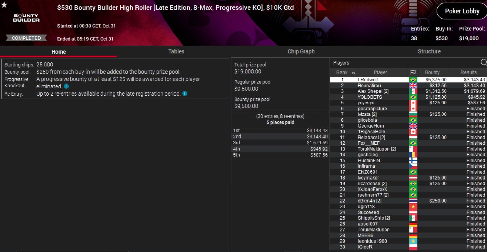 Bei den Tagesturnieren sorgte wieder einmal Dominik „Bounatirou“ Nitsche mit Platz 2 beim $530 Bounty Builder Late Edition und Platz 6 beim $1.050 Monday 6-Max für Top-Ergebnisse.