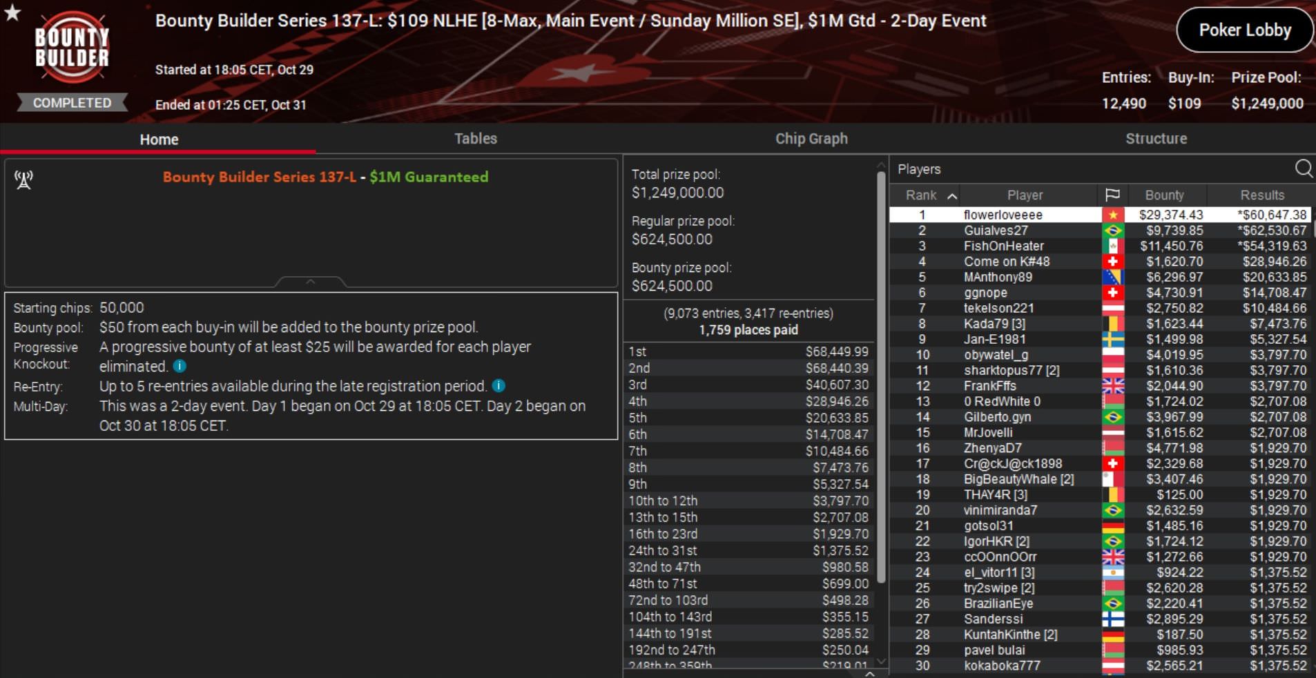 Den Sieg im kleinen Main Event (gleichzeitig Sunday Million) und $90.000 holte sich „flowerloveeee“ aus Vietnam.