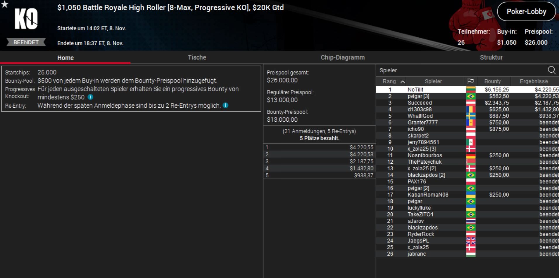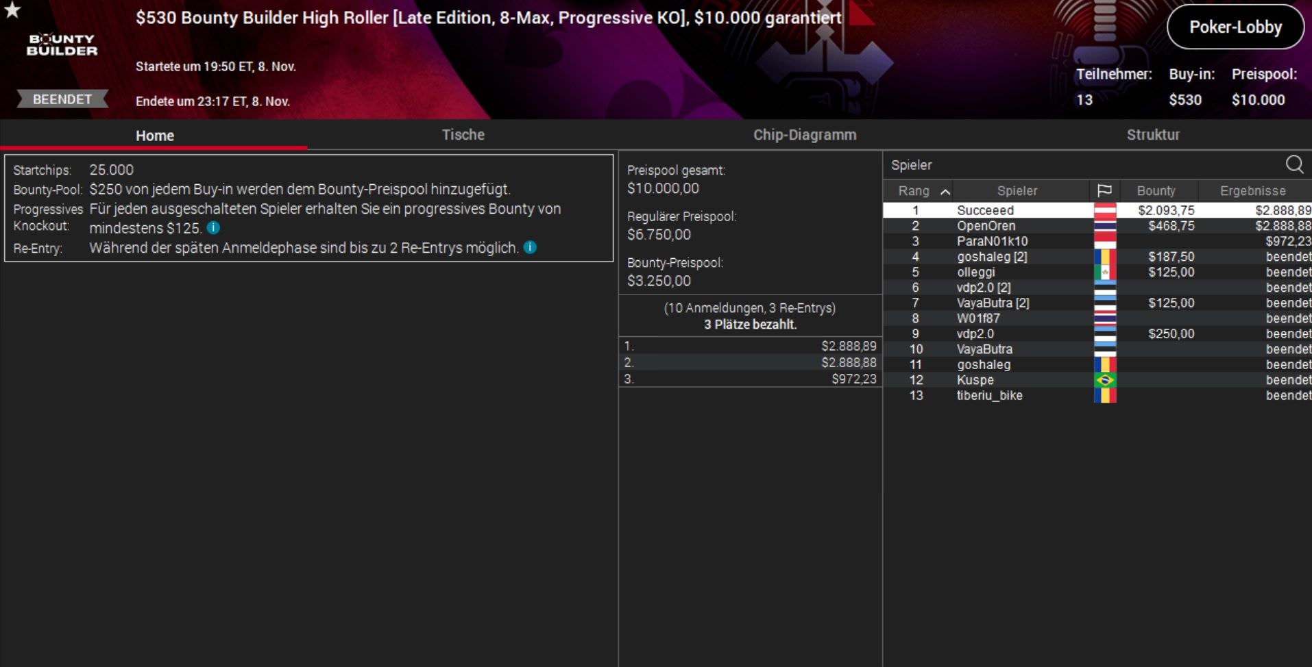 Noch besser lief es tief in der Nacht beim $530 Bounty Builder Late Edition, den er vor 12 Konkurrenten als Sieger abschloss. Als Belohnung erhielt er weitere rund $5.000 Preisgeld obendrauf.