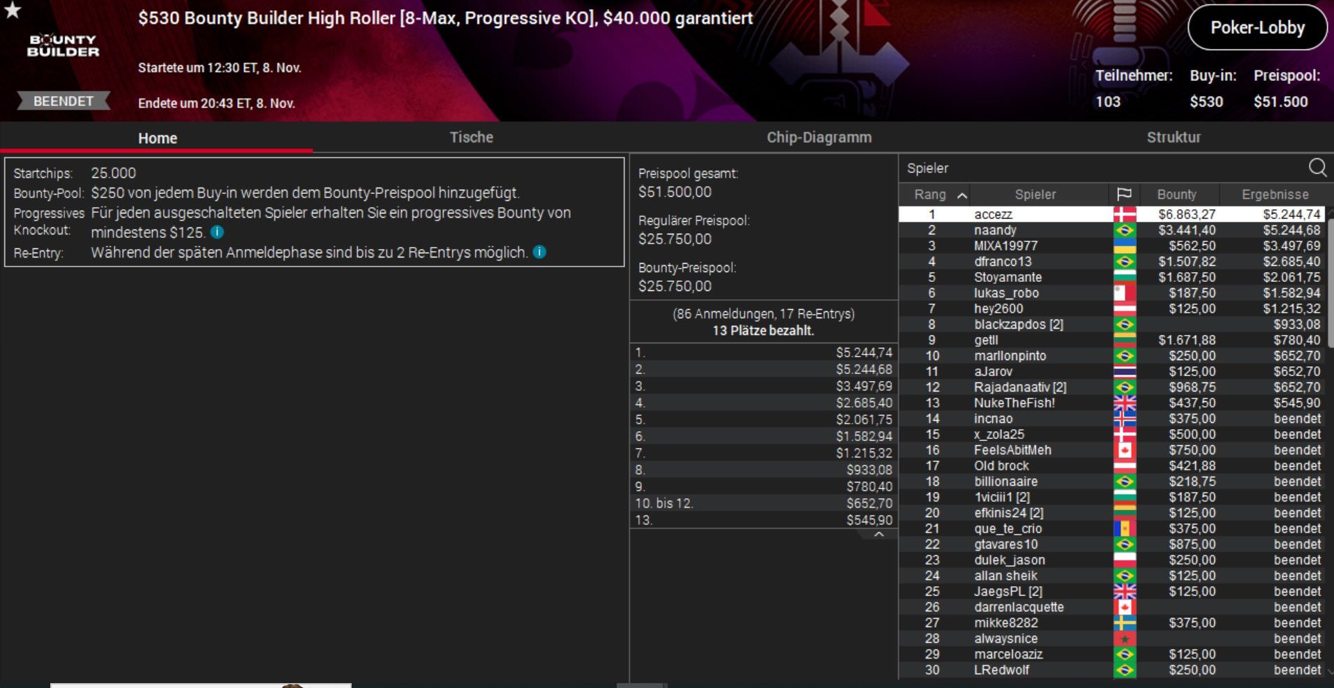 Größter Gewinner des Tages war der Däne „accezz“, der für seinen Sieg beim normalen $530 Bounty Builder rund $12.000 abräumte.