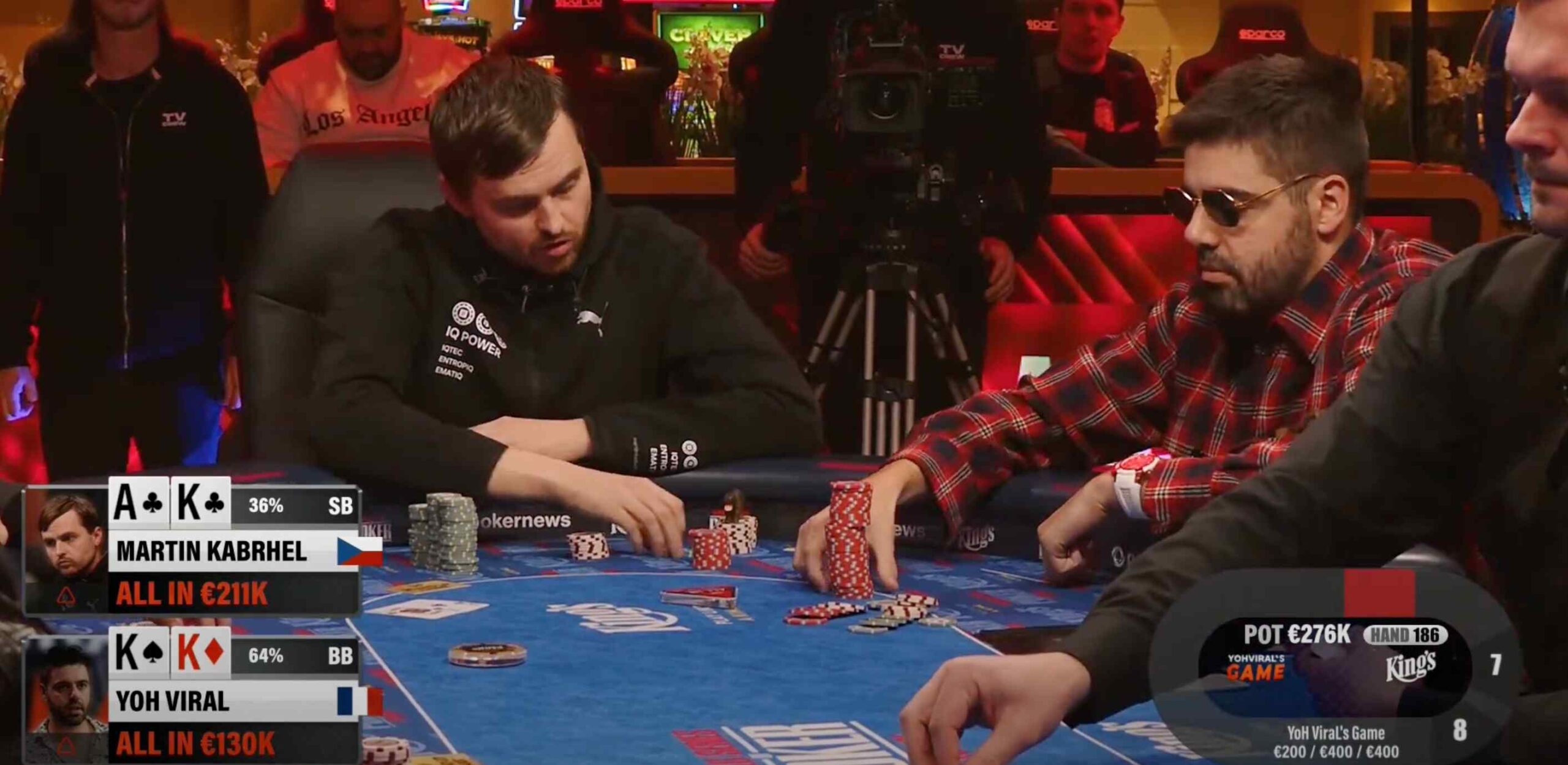 YoH-Viral spielt eine 3-Bet auf €14,4k mit Königen nach einem Open-Raise von Rob Yong und Martin Kabrhel, der das Open nur gecallt hat, sitzt mit Ass-König suited da und schiebt seinen €211k Stack in die Mitte. YoH Viral callt und ein €276.000 Pot braute sich zusammen.