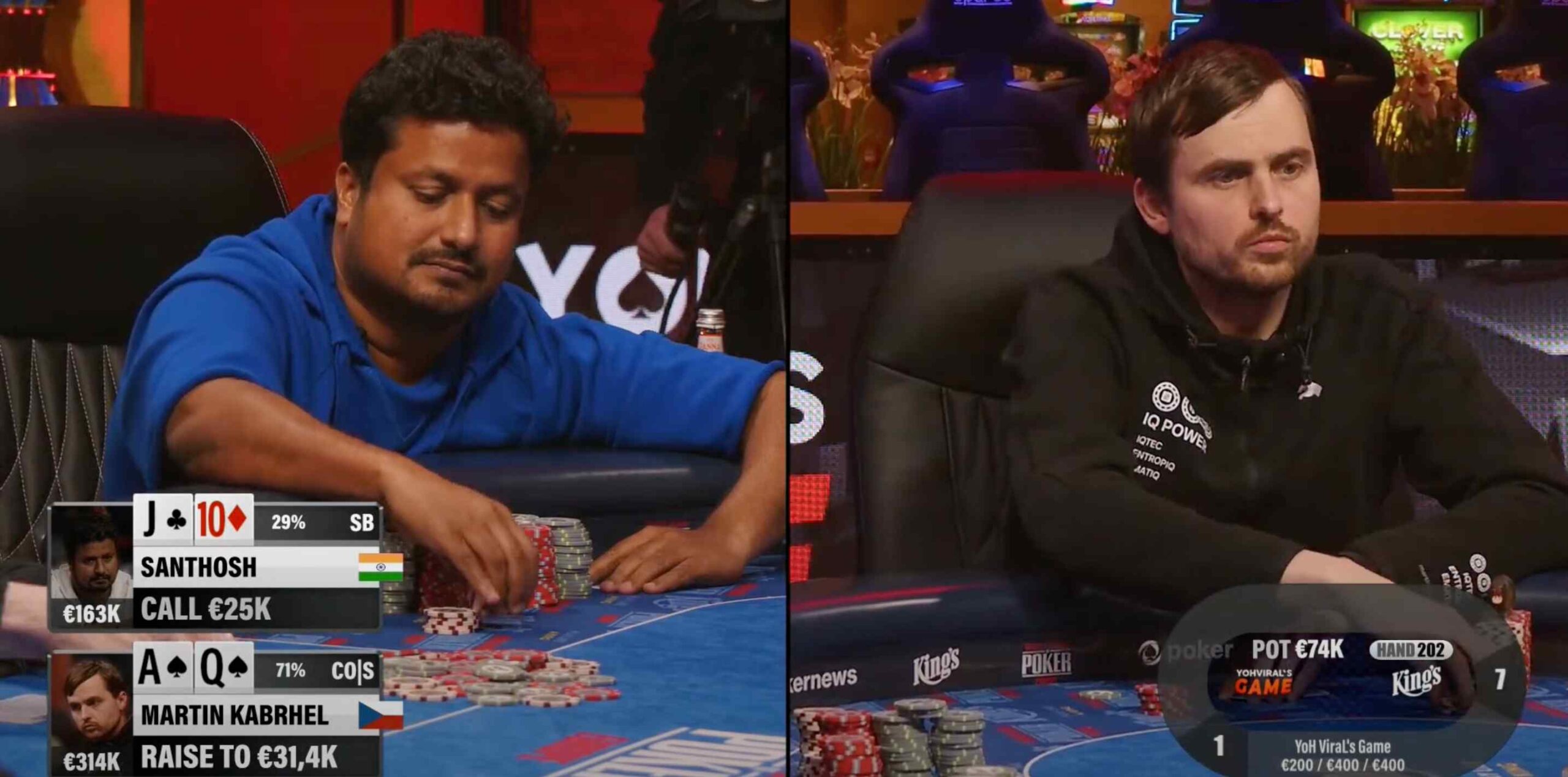 Santosh checkte, Kabrhel spielte €110k an und der Inder stellte seinen Stack inklusive restlichen knapp €50k in die Mitte – Kabrhel callte und im €400.000 Pot war Kabrhel Drawing Dead. Egal was der River brachte, der Inder konnte sich bereits über einen dicken Pot freuen.