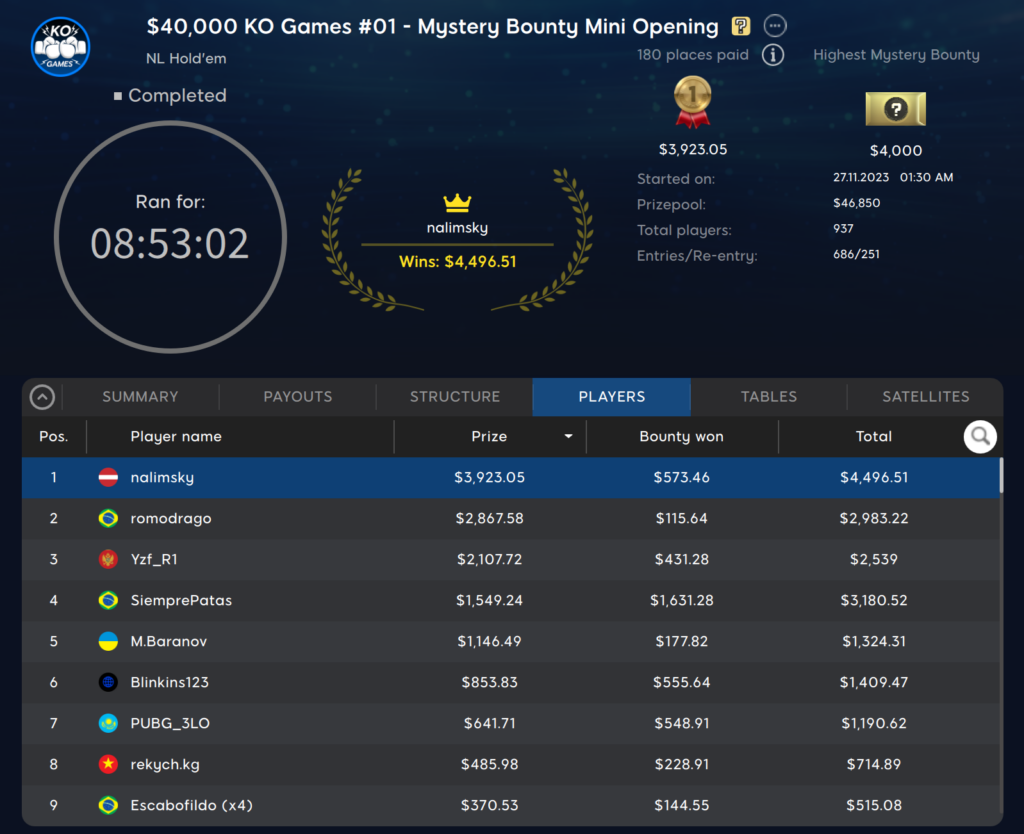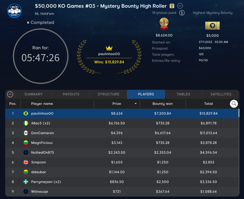 Im Mini Opening war der Österreicher ‚nalimsky‚ erfolgreich. Er gewann ein $3.923 Preisgeld und $573 aus dem Bounty Preispool. Das High Roller wurde sich von einem Brasilianer gesichert. ‚paulinhooOO‚ verdiente sich insgesamt $15.829 ($7.205 aus Bounties) in diesem Turnier.