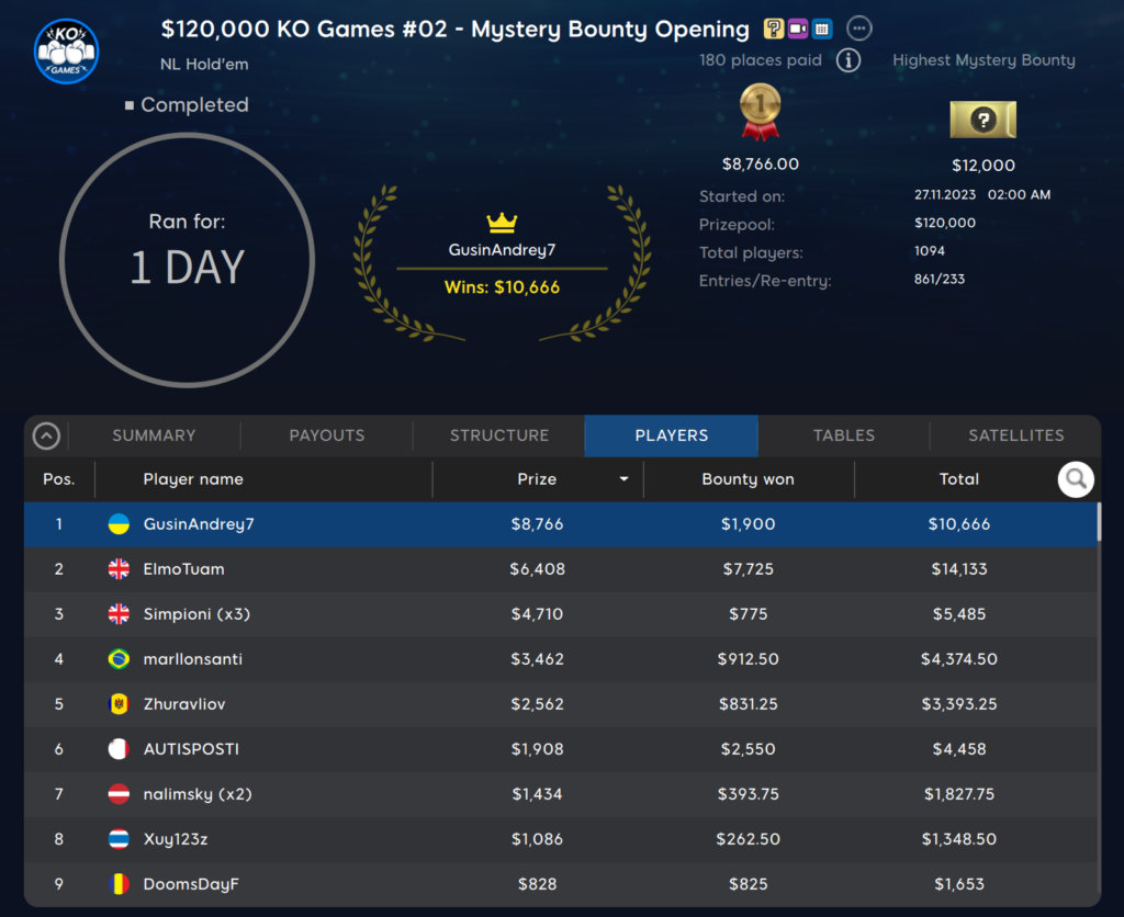Das Turnier hatte $120k garantiert und die Garantie wurde mit den 1.094 Entries (233 davon waren Re-entries) nicht geknackt. Als Sieger konnte der Ukrainer ‚GusinAndrey7‚ hervorgehen. Er erhielt insgesamt $10.666 ($1.900 davon warn Kopfgelder).