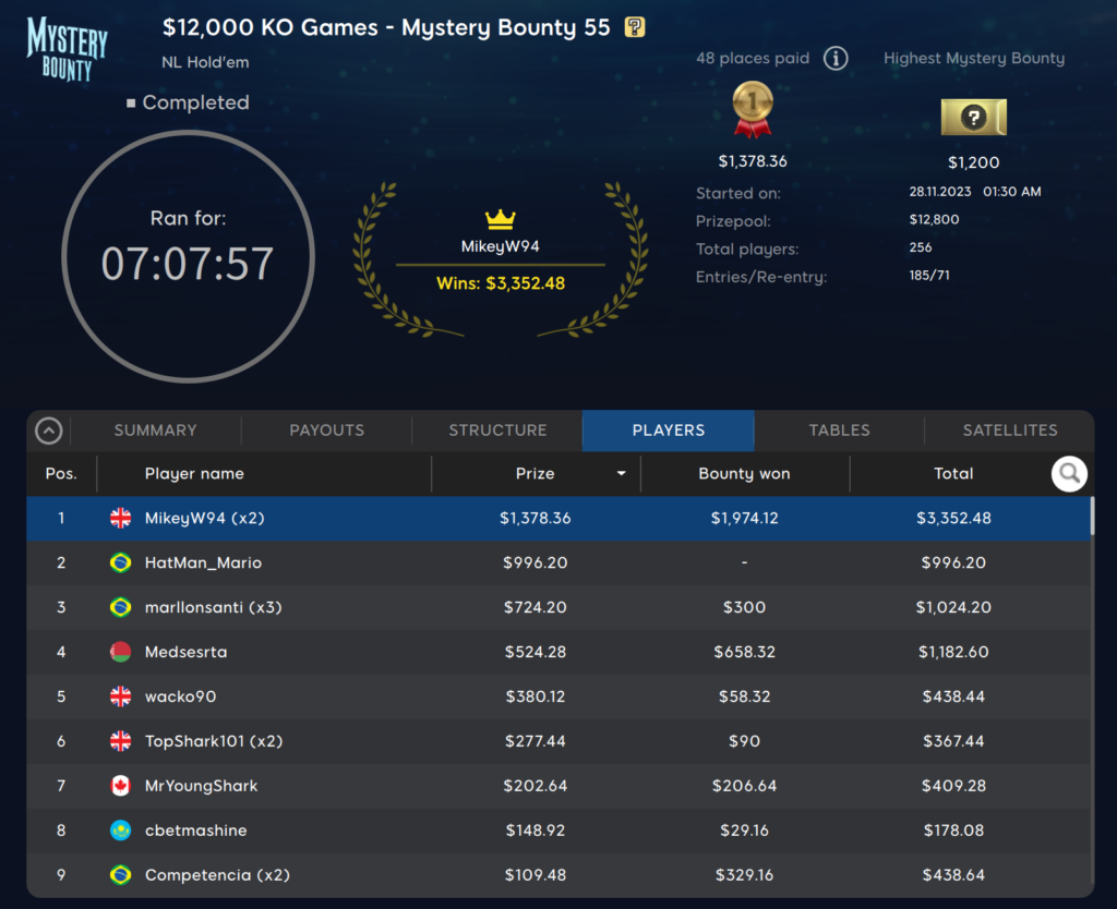 Aber das war nicht alles, was Bounty-Turniere anging. Es gab außerdem das $55 KO Games Mystery Bounty 55, an dem 185 Spieler teilnahmen. Mit 71 Re-entries kamen wir somit auf einen Preispool von $12.800. Den größten Anteil daran gewann der Brite ‚MikeyW94‚. Er sackte $1.378 an Preisgeldern und $1.974 an Bounties ein.