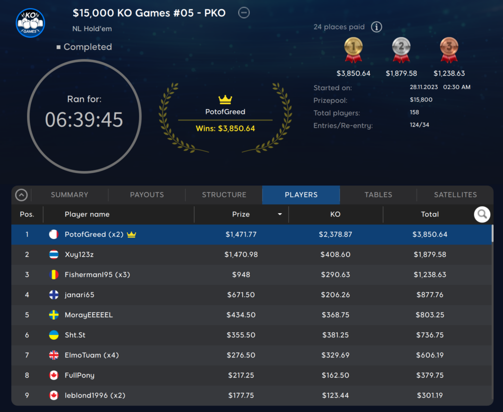 Das fünfte Event im Bunde war das $109 KO Games #05 – PKO, das nur ganz knapp, um $800, die Garantie von $15.000 knackte. Gewinner dieses Events war ‚PotofGreed‚ für insgesamt $3.850 ($2.378 Bounties).