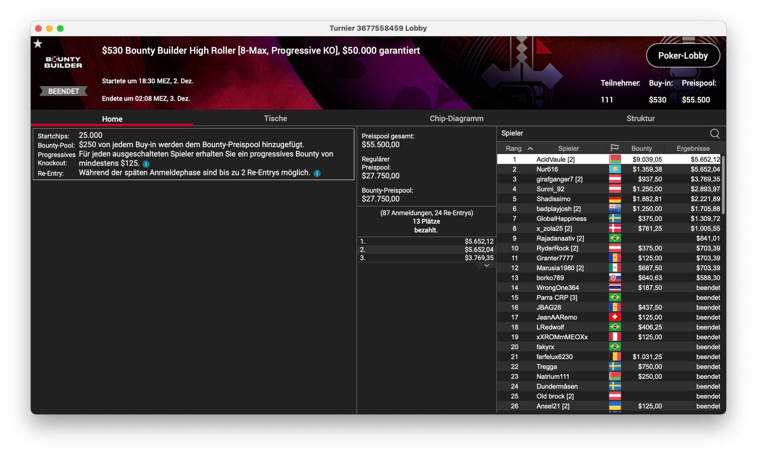 Das $530 Bounty Builder HR hatte 111 Entries und $55.500 Preispool, „AcidVaule“ holte sich den Sieg für $9.039 + $5.652. Bert „girafganger7“ Stevens wurde Dritter für $937 + $3.769.