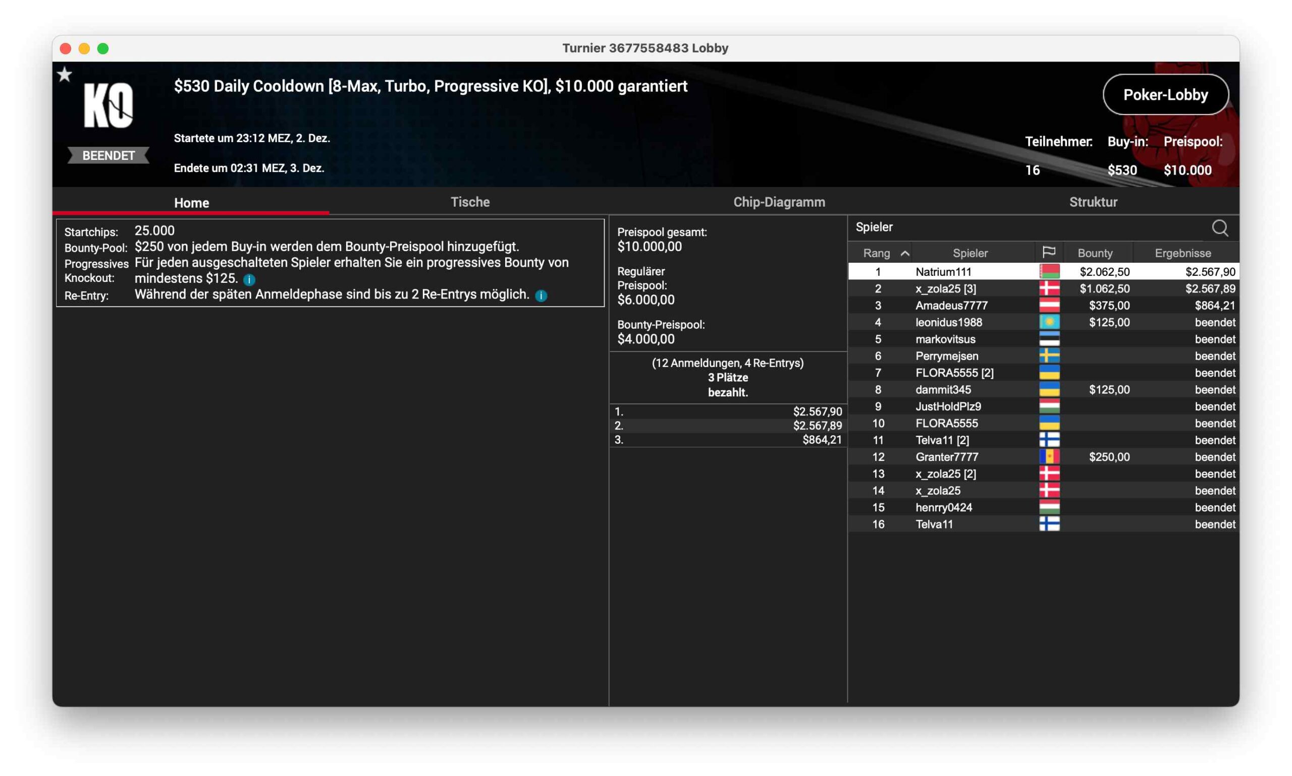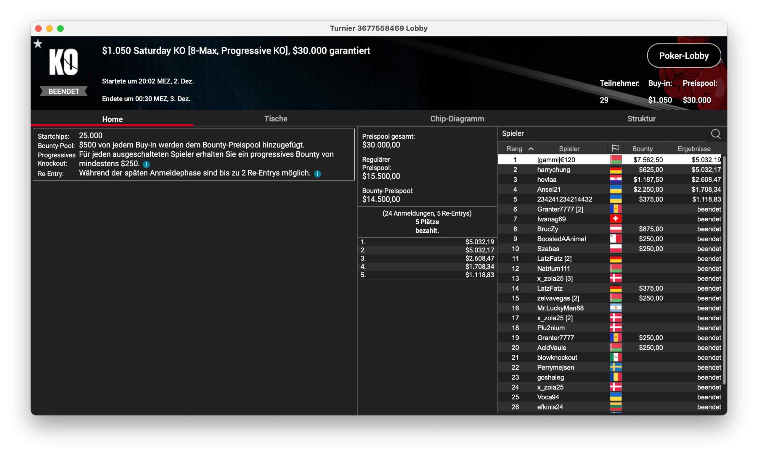Beim $1.050 Saturday KO gingen 29 Entries an den Start – $30.000 Garantie wurden hier ausgespielt. Der Sieg ging an „|gammi|€120“ für $7.562 + $5.032. Der deutsche Spieler „harrychung“ wurde Runner-Up für $625 + $5.032.