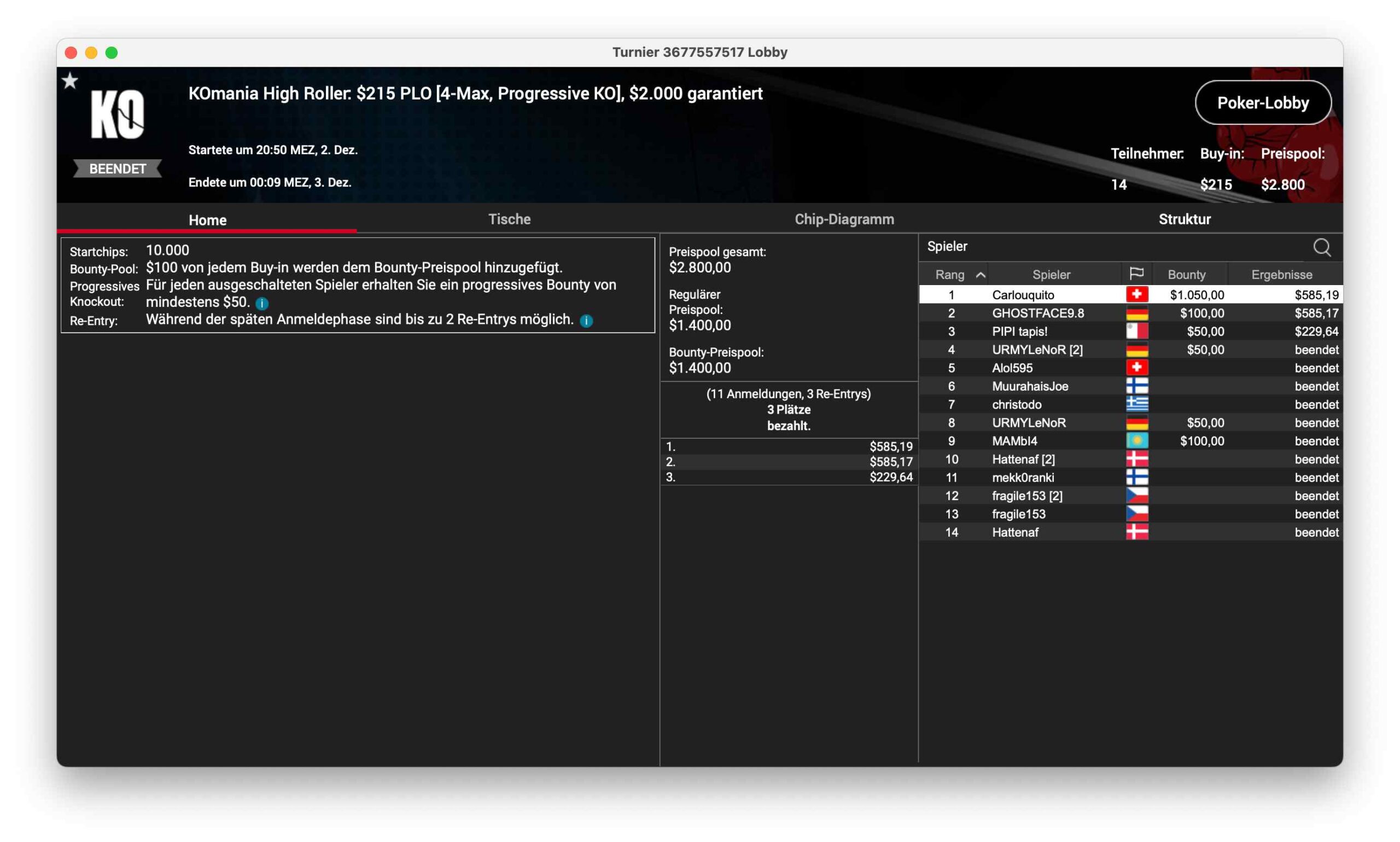 Der Schweizer „Carlouquito“ sicherte sich den Sieg beim $215 KOmania High Roller PLO mit 14 Entries und $2.800 Preispool. Der Sieg brachte ihm mit $1.050 + $585 mehr als die Hälfte des Preispools ein.