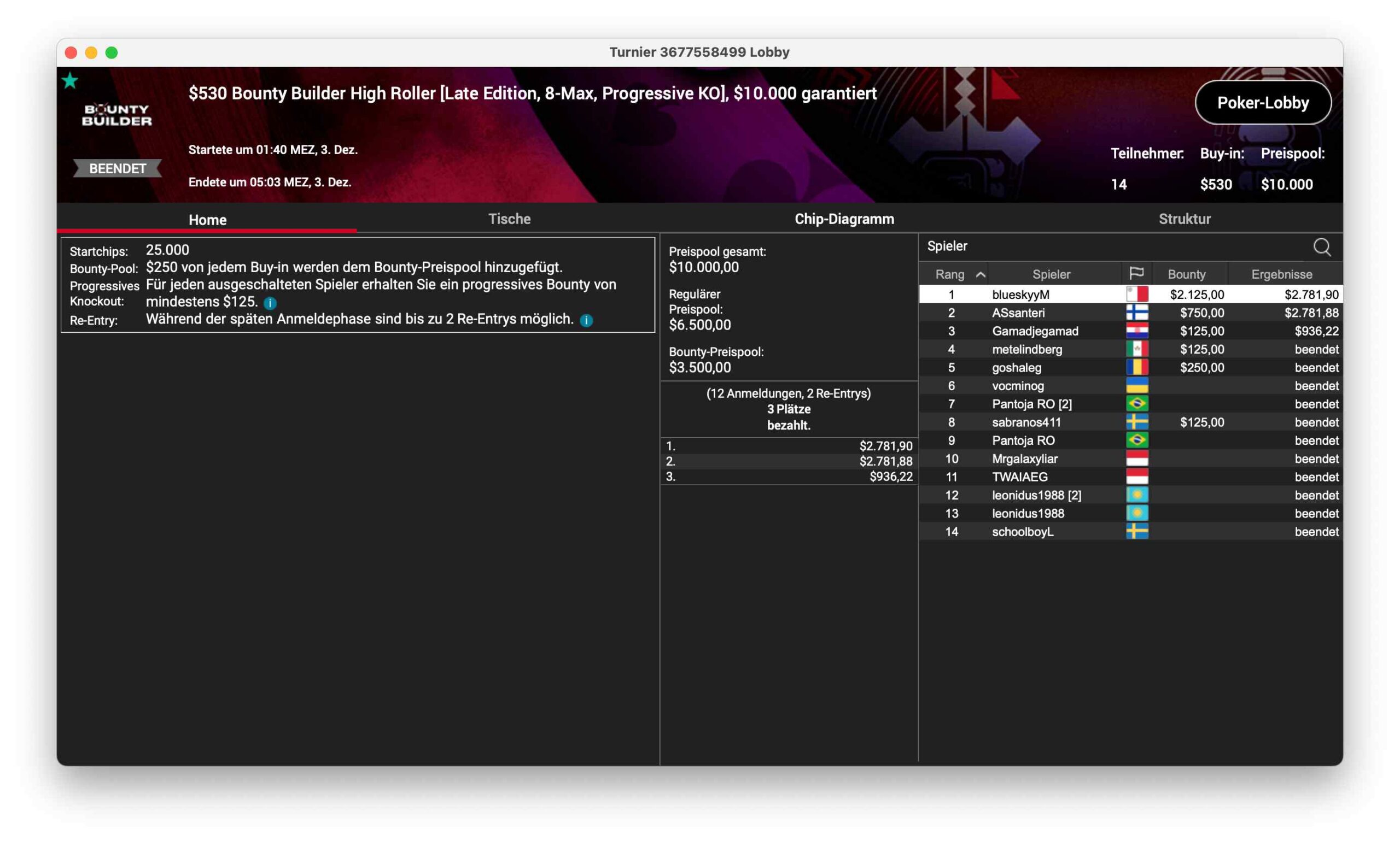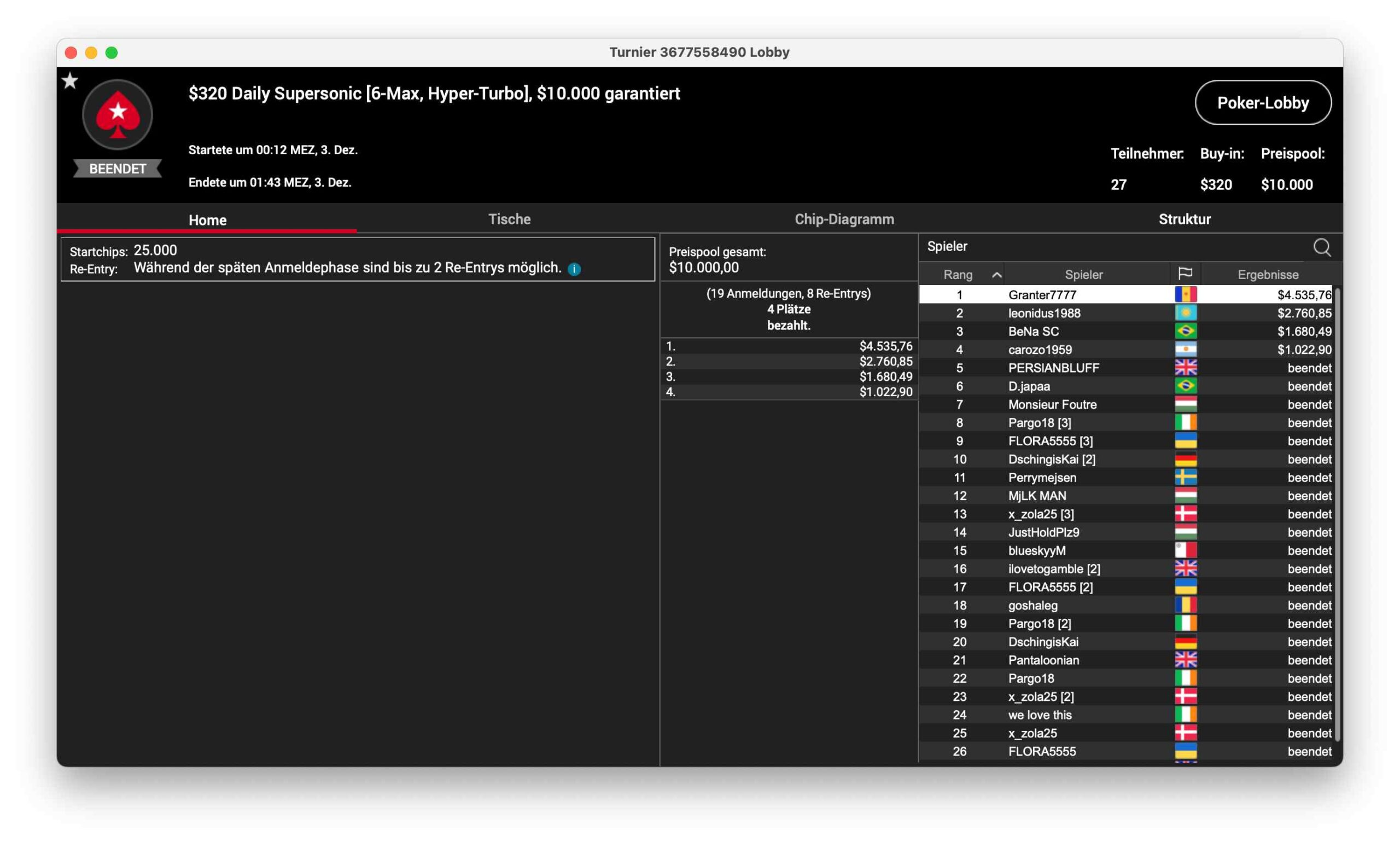 Das $320 Daily Supersonic hatte 27 Entries und durch die Garantie einen $10.000 Preispool. Der Sieg ging nach Rumänien an „Granter7777“ für $4.535.