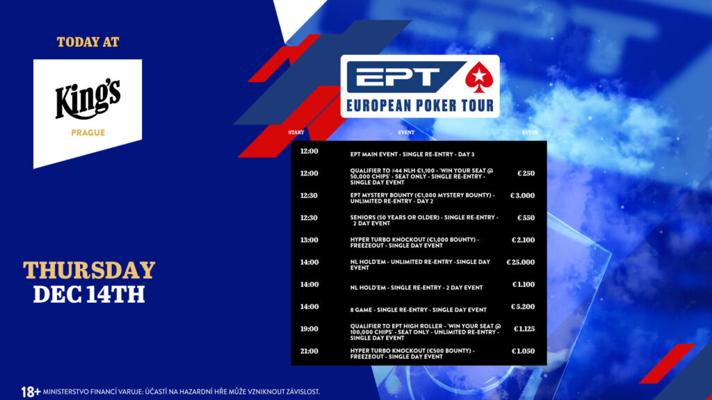 Im King’s Prag läuft, wie erwähnt, die European Poker Tour (EPT). Hier ist heute wieder eine Menge los. Alle Augen sind natürlich vor allem auf den Tag 3 des Main Event gerichtet. Dieser startet um 12:00 Uhr. Um 12:30 Uhr gibt es ein €550 Seniors Event für Spieler über dem Alter von 50 Jahren. Dann haben wir noch ein €2.100 Hyper Turbo Knockout um 13:00 Uhr, ein €1.100 NLHE um 14:00 Uhr, ein €5.200 8-Game ebenfalls um 14:00 Uhr, ein €25.000 NLHE um dieselbe Uhrzeit und ein €1.050 Hyper Turbo Knockout um 21:00 Uhr. Des weiteren laufen einige Satellites.