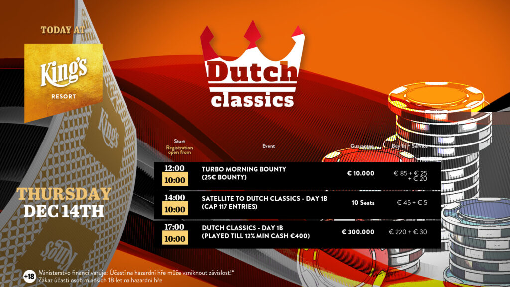 Heute gibt es im King’s Resort neben einem €130 Turbo Morning Bounty um 12:00 Uhr und einem €50 Satellite für das Dutch Classics Main Event Day 1B um 15:00 Uhr auch direkt den Tag 1B. Für €250 erhalten Spieler ab 17:00 Uhr einen 50.000 Start Stack. Gespielt werden 30-Minuten Levels und die Registrierung ist noch geöffnet bis Level 9. Vier 2024 WSOP Europe Tickets sind im €300.000 Preispool inklusive.