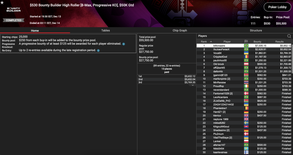 Kommen wir zu den beiden $530 Bounty Builder High Roller 8-Max PKO Turnieren. Im ersten konnte man den Amazonas kaum sehen vor lauter brasilianischer Flaggen. Unter den Top 15 Spielern waren insgesamt acht Brasilianer vertreten. Zwei davon schafften es auch ins Heads-up und „billionaaire“ etablierte sich letztendlich als Sieger für $5.652 und $7.035 an Bounties.