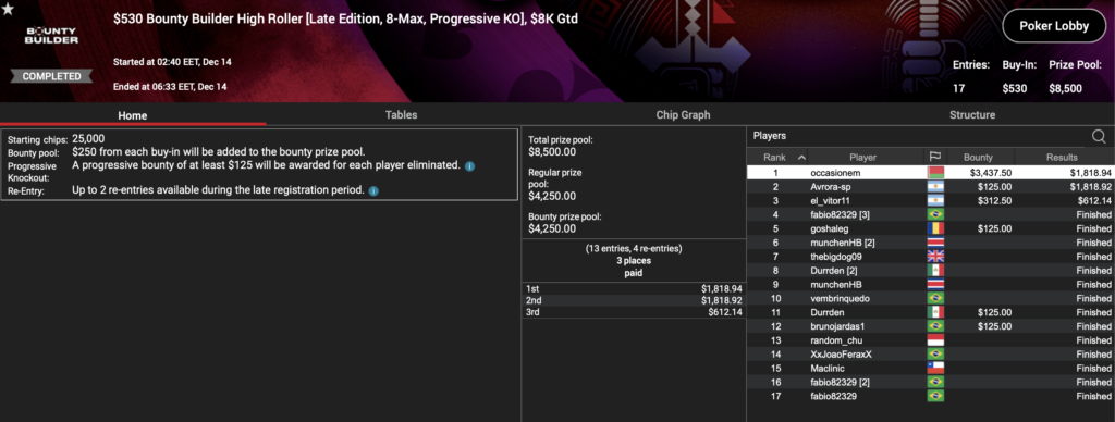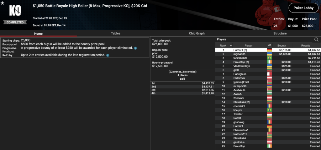 Und zu guter Letzt hatten wir das größte Buy-in Event von gestern, das $1.050 Battle Royale High Roller 8-Max, PKO. Hier gab es 25 Entries und einen Preispool von $25.000. Dieses Turnier konnte einmal mehr vom deutschen Spieler „HardiZ1“ gewonnen werden. Er benötigte zwei Anläufe, aber sahnte letztendlich $4.437 und $8.125 an Bounties ab.