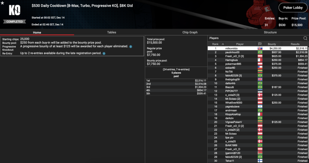 Fangen wir mit dem $530 Daily Cooldown 8-Max Turbo PKO an. Dieses Turnier hatte 31 Entries und somit einen Preispool von $15.500. Fünf Spieler wurden bezahlt und den größten Anteil davon erhielt der Slovake „milkomildo“. Er gewann $2.516 aus dem regulären Preispool und $4.250 an Bounties.