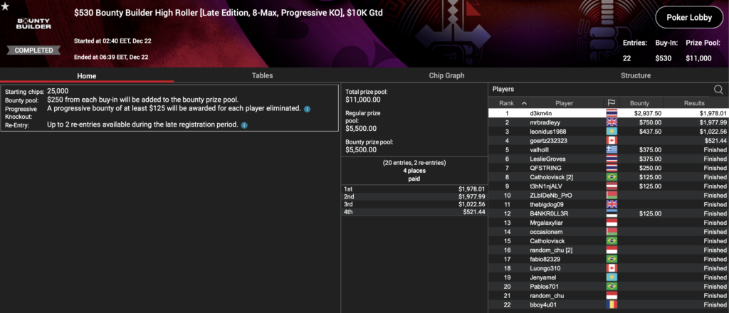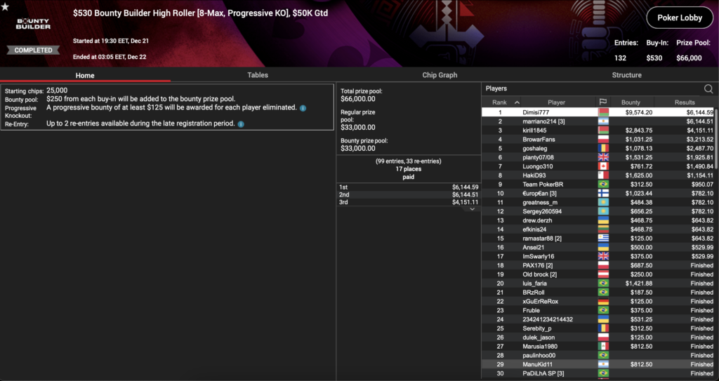 Und dann kommen wir zu den beiden $530 Bounty Builder High Roller 8-Max PKO. Das erste der beiden hatte 132 Entries und somit einen $66.000 Preispool. 17 Spieler wurde. hier bezahlt, aber der einzige, der über den Sieg feiern konnte, war ‚Dimisi777‚ aus Weißrussland. Dieser erhielt $6.144 plus $9.574 für den Sieg.
