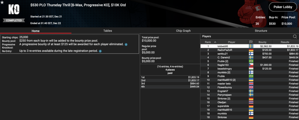 Es gab auch eine Thursday Thrill 4-Karten Version mit dem $530 PLO Thursday Thrill 6-Max PKO. In diesem Event hatten wir insgesamt 20 Entries und somit wurde die $10k Garantie gerade so erreicht. Wir hatten hier eine Zweitplatzierung für Deutschland mit ‚RaZorFaZoR‚ für $1.833 plus $2.562 an Bounties. Der Gewinner kam allerdings aus Schweden mit dem Namen ‚tobbeb95‚. Dieser erhielt $1.833 aus dem reguären und $2.562 aus dem Bounty-Preispool.