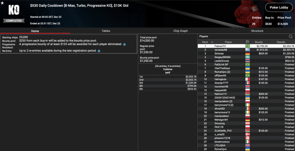 Der $530 Daily Cooldown 8-Max Turbo PKO hatte 29 Entries und somit einen Preispool von €14.500. Den größten Anteil erhielt hier der Brasilianer ‚Pablos701‚ für $2.353 plus $2.750. Auf Platz 3 hatten wir auch eine Vertretung aus Deutschland mit ‚Sintoras‘.