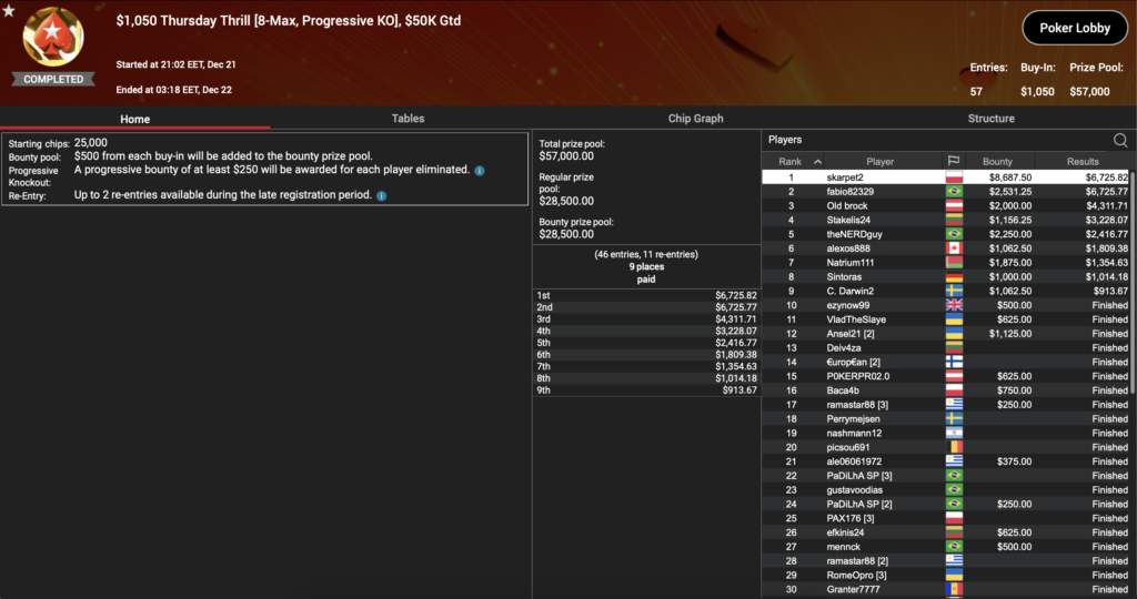 Fangen wir mit dem Haupt-Turnier an jedem Donnerstag an, dem $1.050 Thursday Thrill 8-Max PKO. Dieses Event fand 46 Spieler, die zusätzlich noch 11 Re-entries tätigten. Der Preispool lag somit bei $57.000. Neun Plätze wurden bezahlt und der Sieger ‚skarpet2‚ aus Polen erhielt $6.725 aus dem regulären Preispool und $8.687 aus dem Bounty-Preispool. Auf Platz 3 hatten wir den Spieler ‚Old brock‘ aus Österreich.