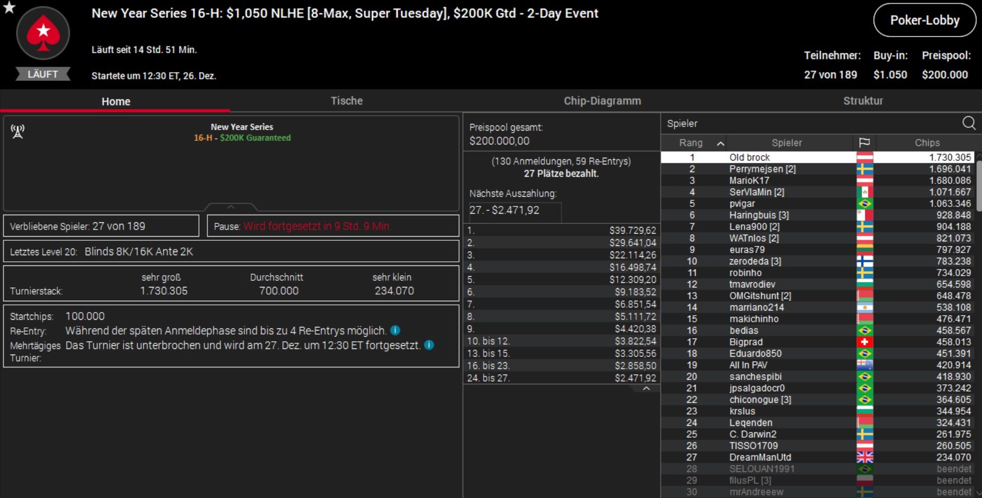 Dort liegt nach dem ersten Turniertag „Old brock“ vor dem Schweden Jerry „Perrymejsen“ Ödeen in Führung und darf sich Hoffnungen auf die Siegprämie von knapp $40.000 machen.