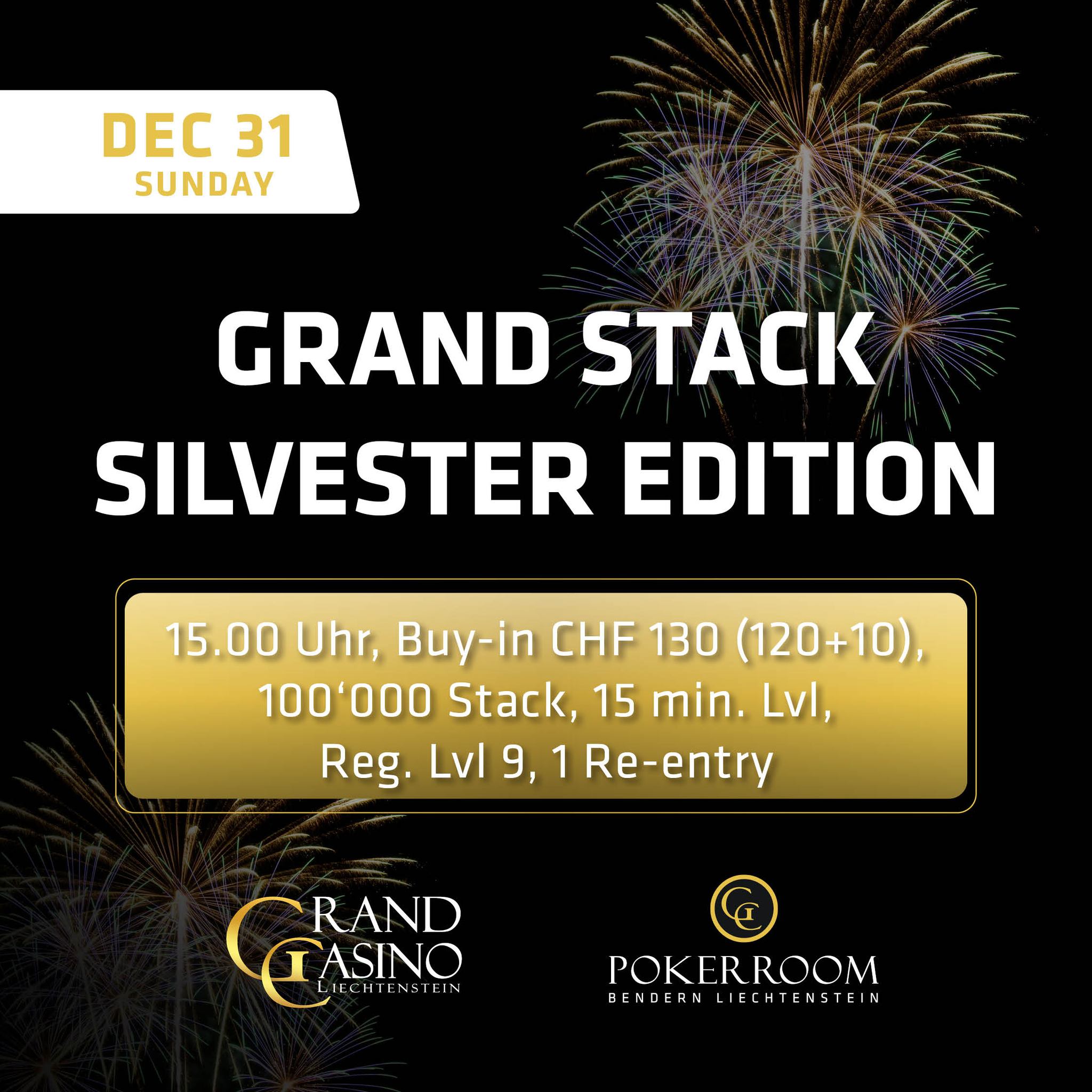 Auch an Silvester muss man im GC Pokerroom nicht auf Turnier-Action verzichten. Ab 15:00 Uhr fliegen die Karten beim CHF 120+10 Grand Stack Silvester Edition Event. Es geht mit 100.000 in Chips los und die Blinds werden alle 15 Minuten erhöht. Ein Re-Entry ist erlaubt und die Late-Registration ist für neun Levels geöffnet.
