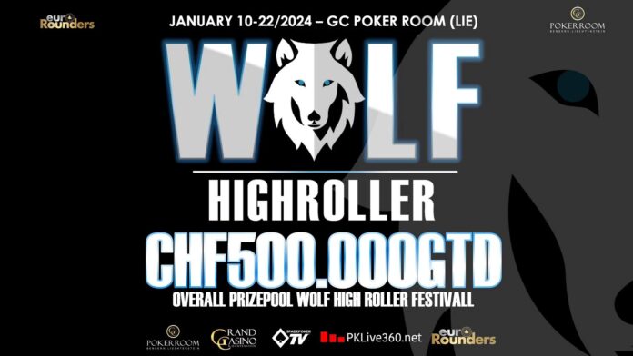 Das Highlight im Poker Januar im Grand Casino Liechtenstein (GCLI) kündigt sich lautstark an: Man kann die unterschiedlichen Wölfe in Gamprin-Bendern förmlich hören, denn vom 10. bis 22. Januar findet das Poker Festival „Wolf Poker Highroller“ powered by euroRounders im GC Pokerroom Bendern statt. Wolf Poker bringt an 12 Tagen 13 Events (2 Main Events, 11 Side Events) in sage und schreibe 37 Flights, Spieltagen oder Satellites mit in das Fürstentum Liechtenstein. Und damit nicht genug – die Garantie für den Festival Prizepool ist liegt bei schlappen 500.000 Schweizer Franken!