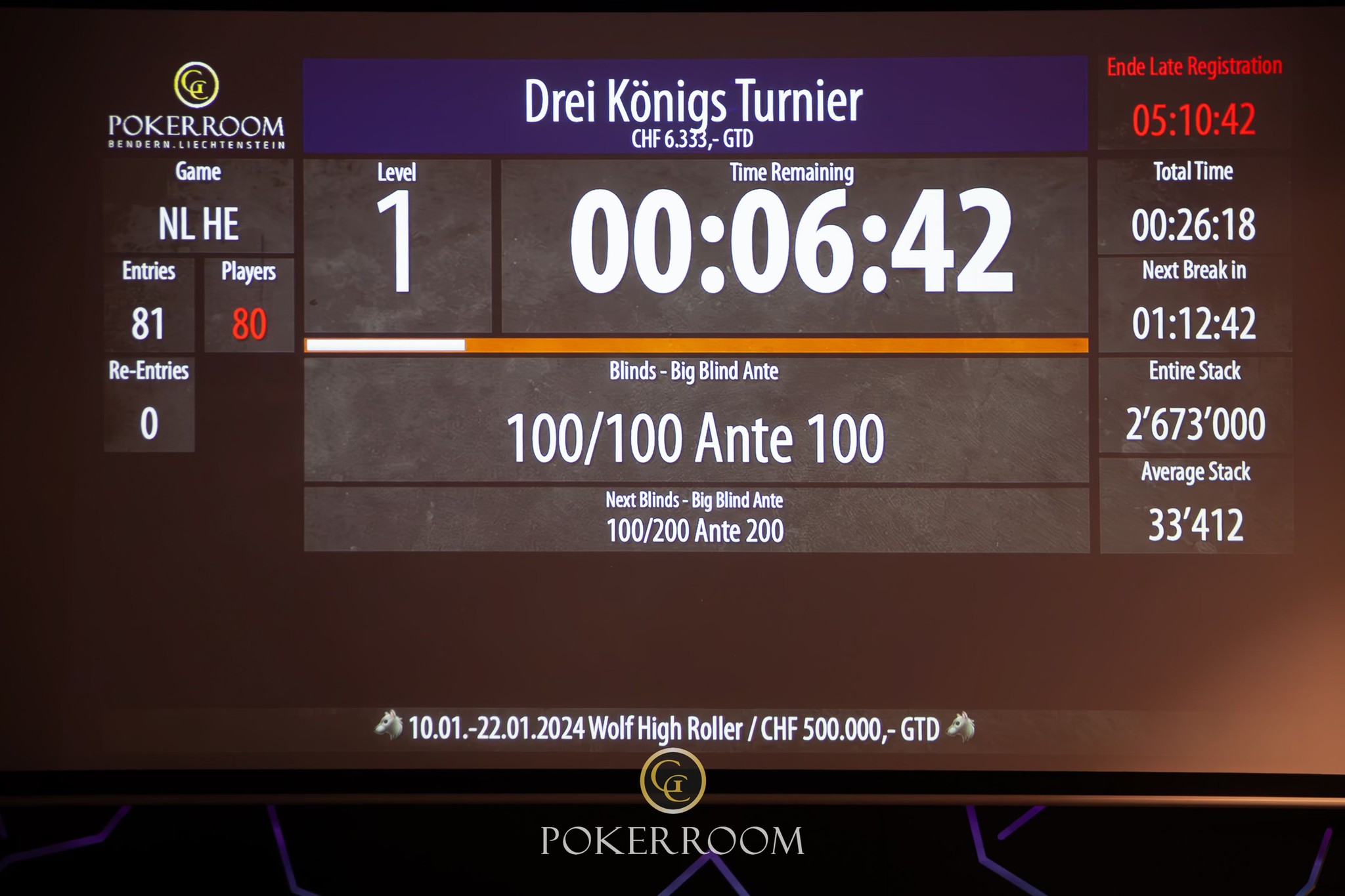Um 17:00 Uhr wurde das Drei Königs Turnier mit dem Anlass geschuldeten 113+20 CHF Buy-In, 33.000 Chips Starting Stack und 33-minütigen Blinds gestartet. 152 Starter*innen pulverisierten die 6.333 Schweizer Franken Garantie bereit zu Turnierstart. Und mit 57 Re-Entries in den ersten 9 Leveln lagen dann unglaubliche 23.617 Schweizer Franken im Topf des (eigentlich) als 1-Tages-Turnier geplanten Feiertagsevents.