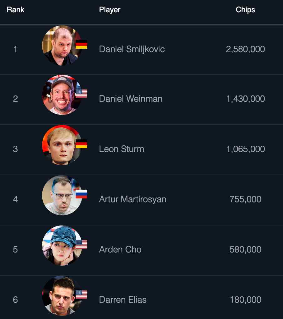 Dafür waren aus deutschsprachiger Sicht Daniel Smiljkovic und Leon Sturm umso erfolgreicher. Smiljkovic führt das Feld mit 2,58 Mio. Chips vor WSOP Champ Daniel Weinman auf Rang 2 mit 1,43 Mio. Chips an.