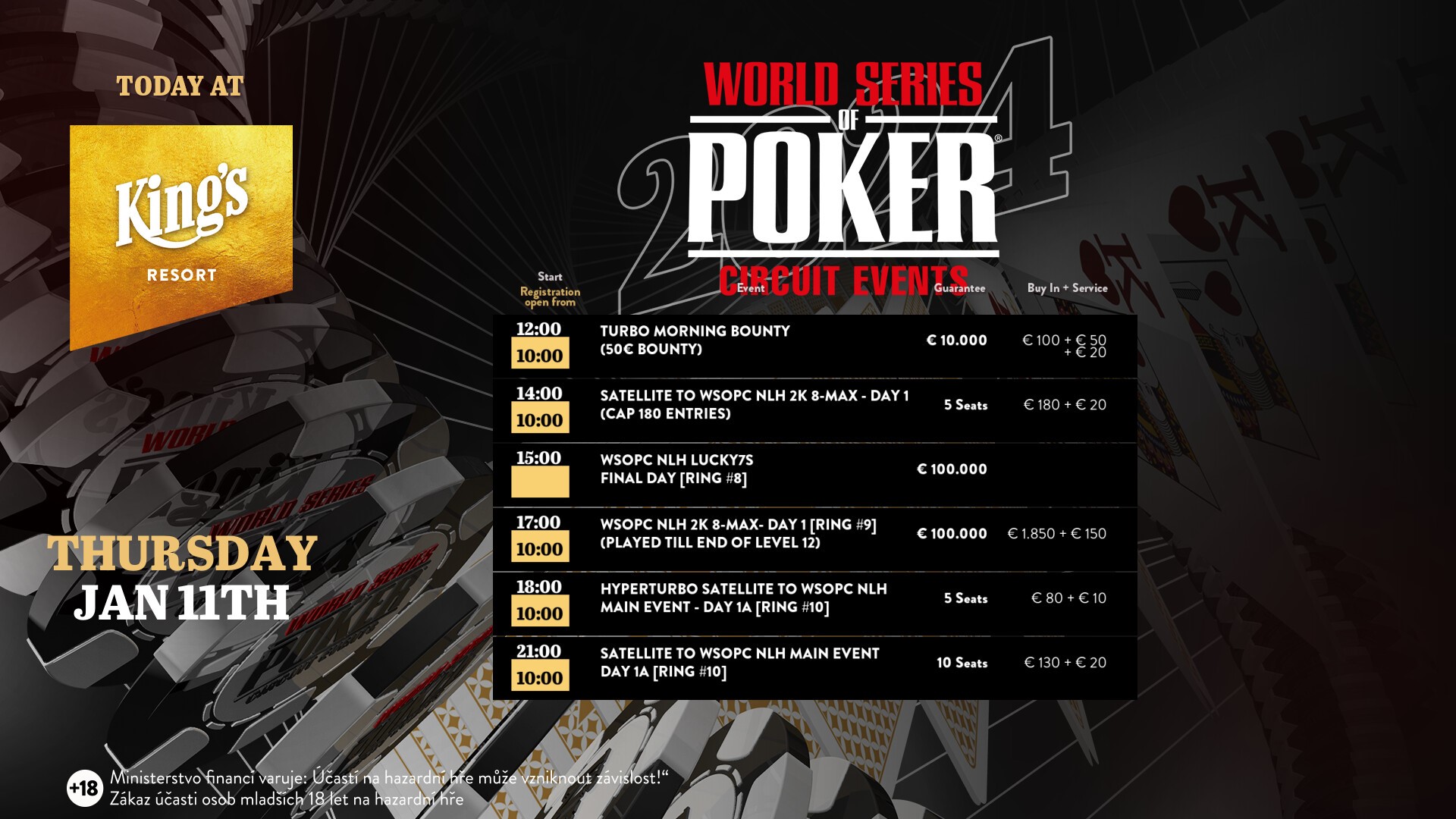 Ein volles Programm erwartet die Spieler auch heute im King’s Resort Rozvadov. Neben drei Satellites und dem Finale beim WSOPC Lucky 7s sind um 17 Uhr Tag 1 des €1.850+150 NLH 2k 8-Max und um 12 Uhr das €100+50+20 Turbo Morning Bounty angesetzt.