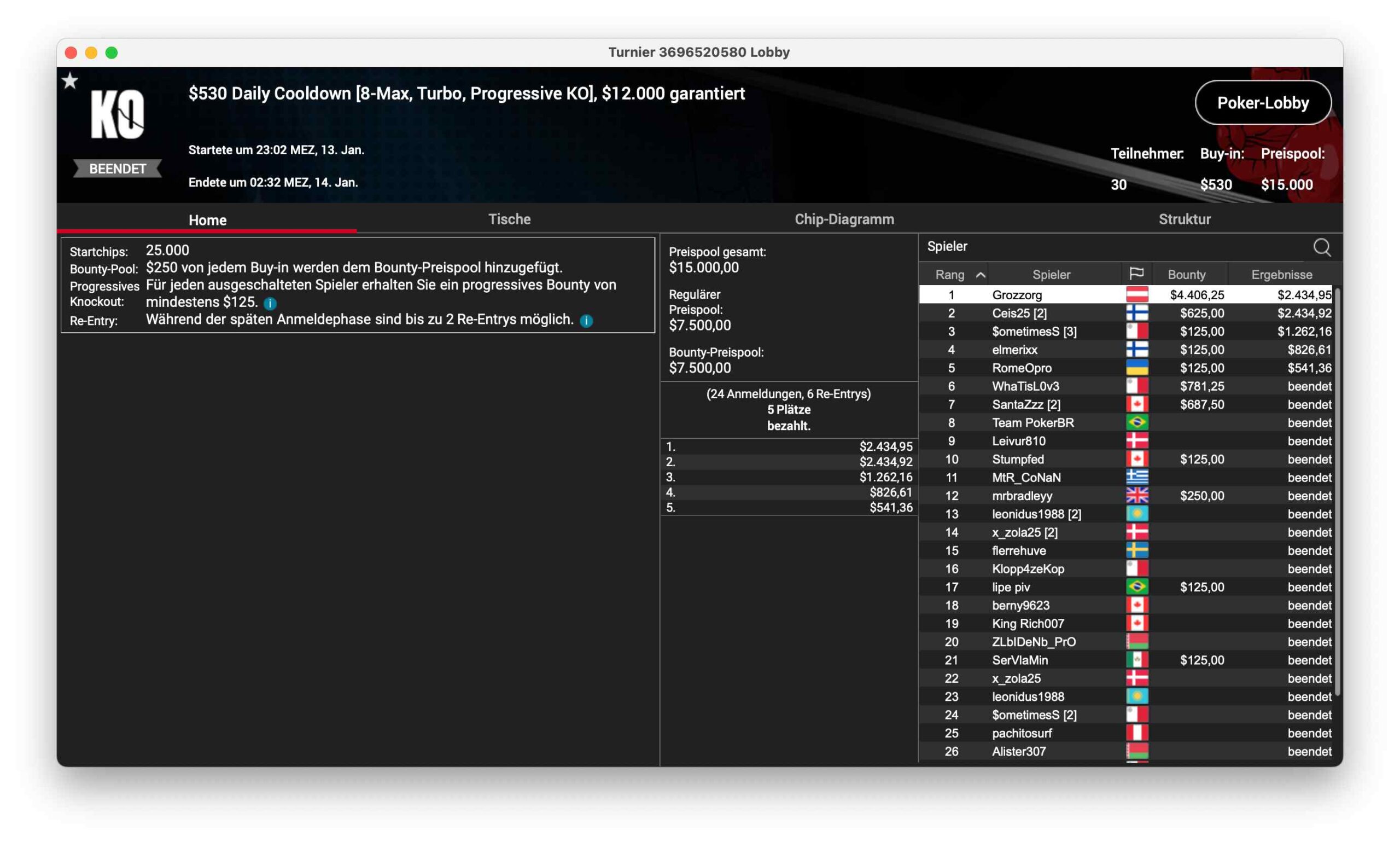 Leo Maue rettete die DACH-Ehre mit einem Sieg beim $530 Daily Cooldown. 30 Entries kamen in dem Turnier zusammen, $15.000 kamen im Preispool zusammen. Leo „Grozzorg“ Maue gewann für $4.406 + $2.434.