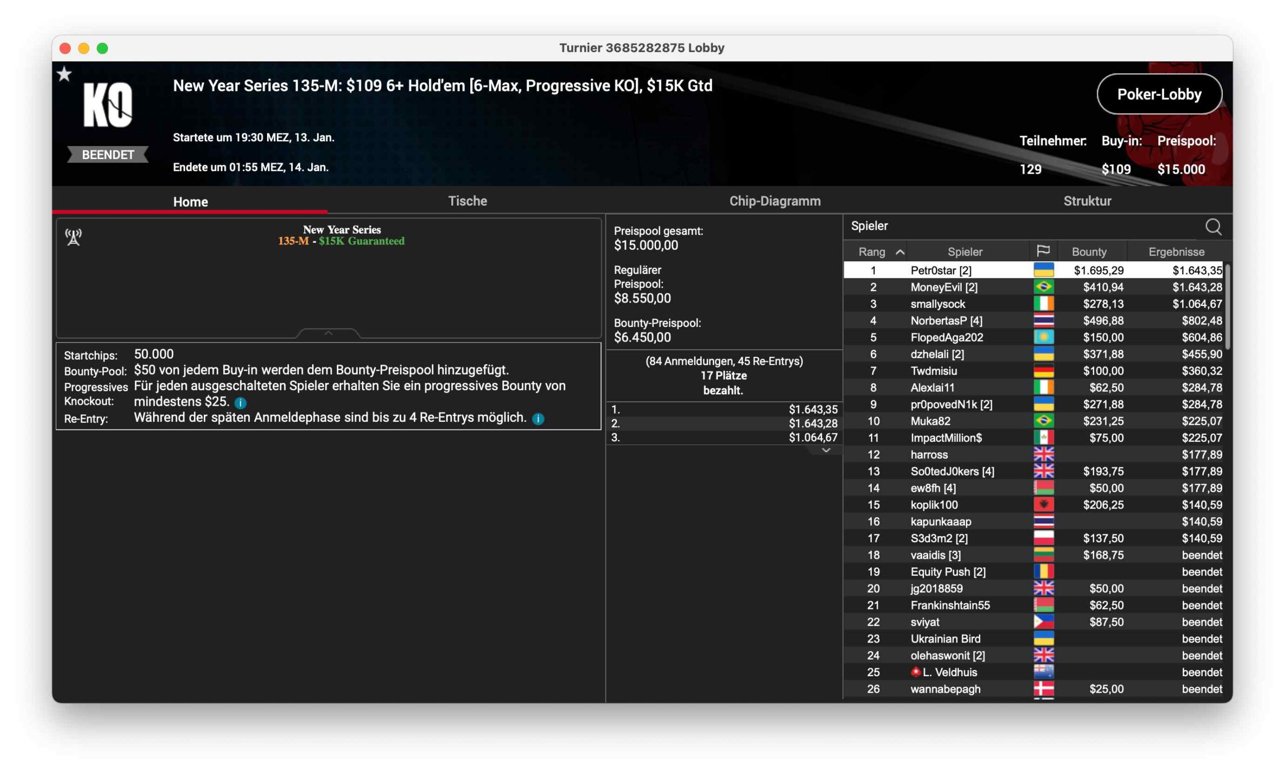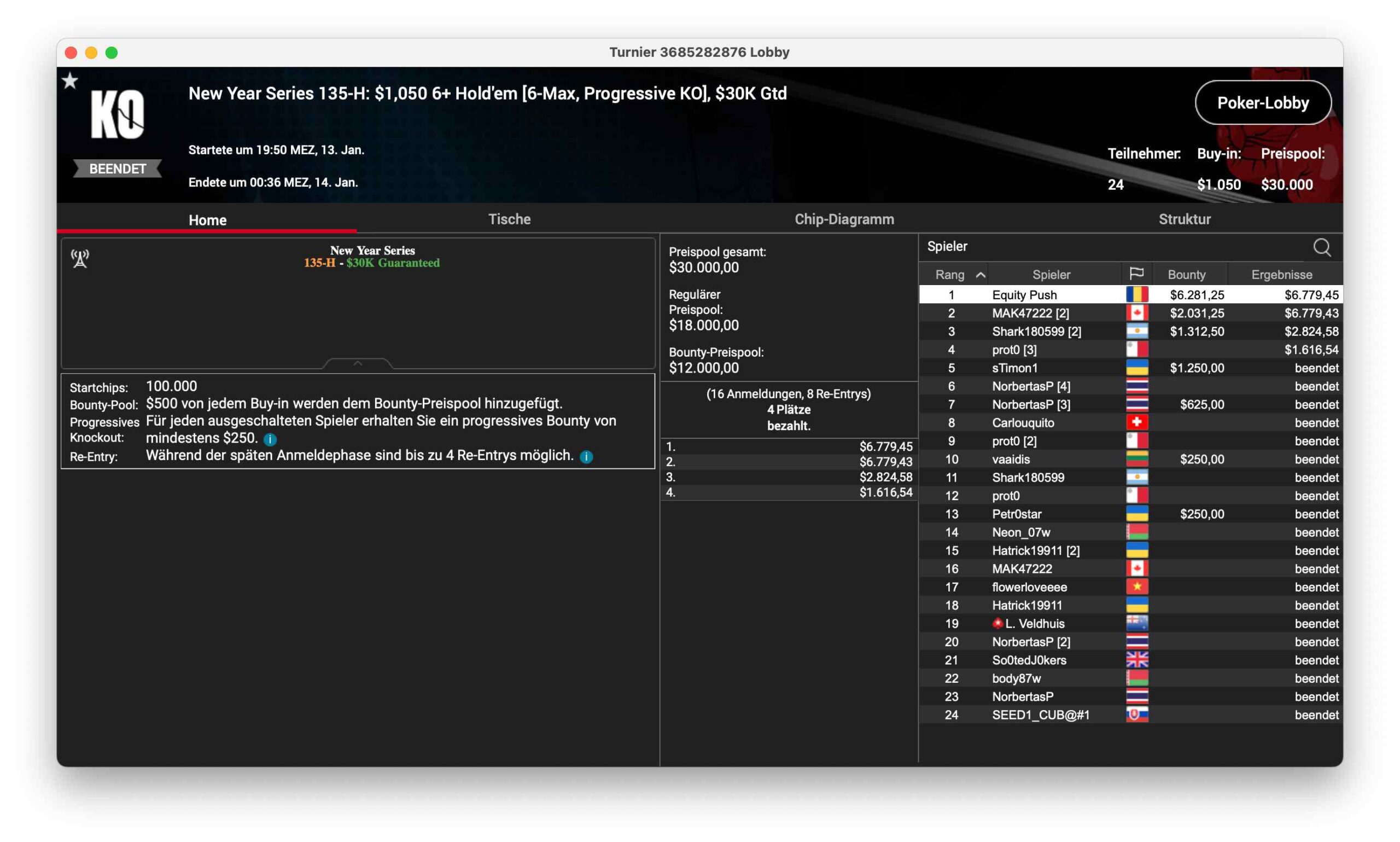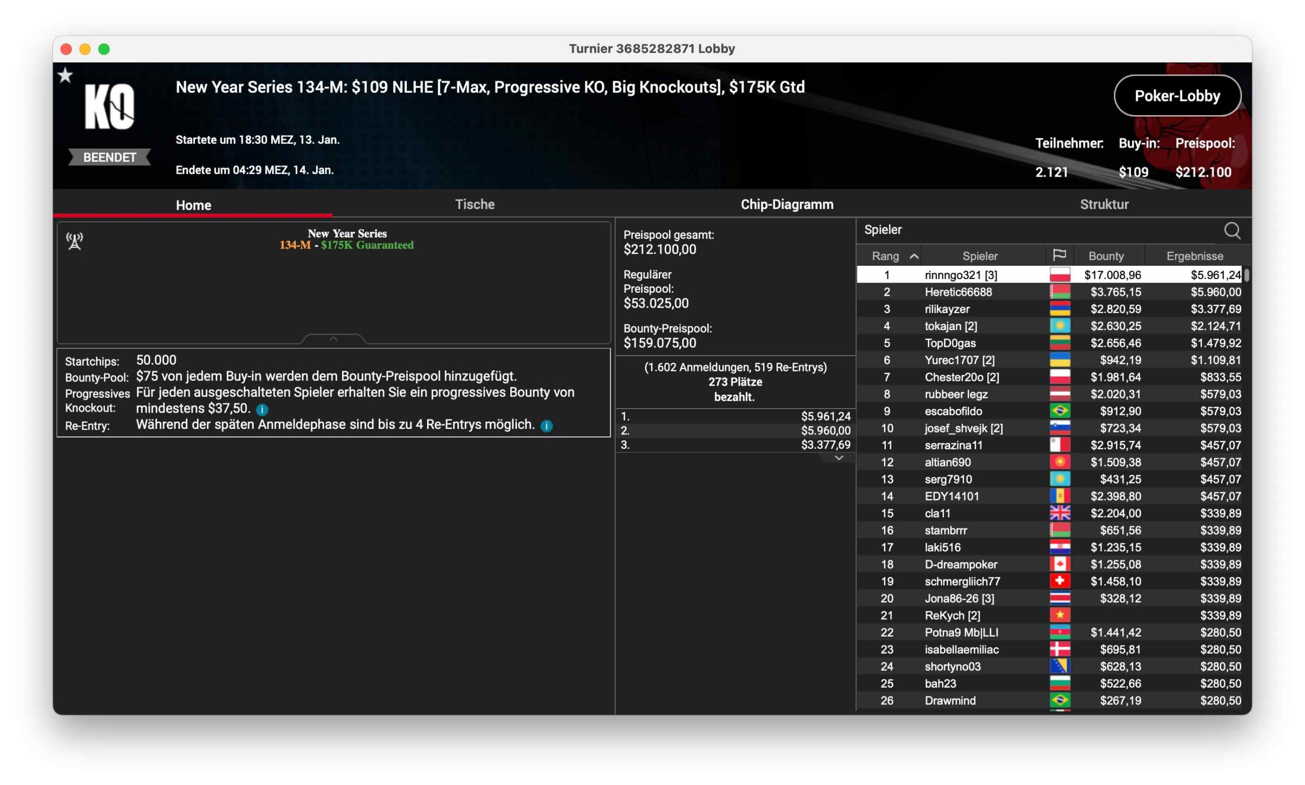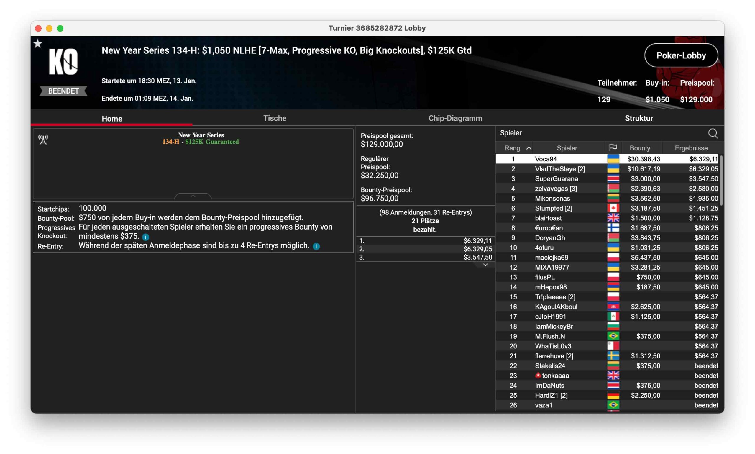 Das größte Turnier der New Year Series war das 134-H, ein $1.050 NLHE PKO Big Knockouts, dort werden $750 aus dem Buy-In zu den Bounties hinzugefügt statt der Hälfte. „Voca94“ aus der Ukraine machte Platz 1 für $30.398 + $6.329.