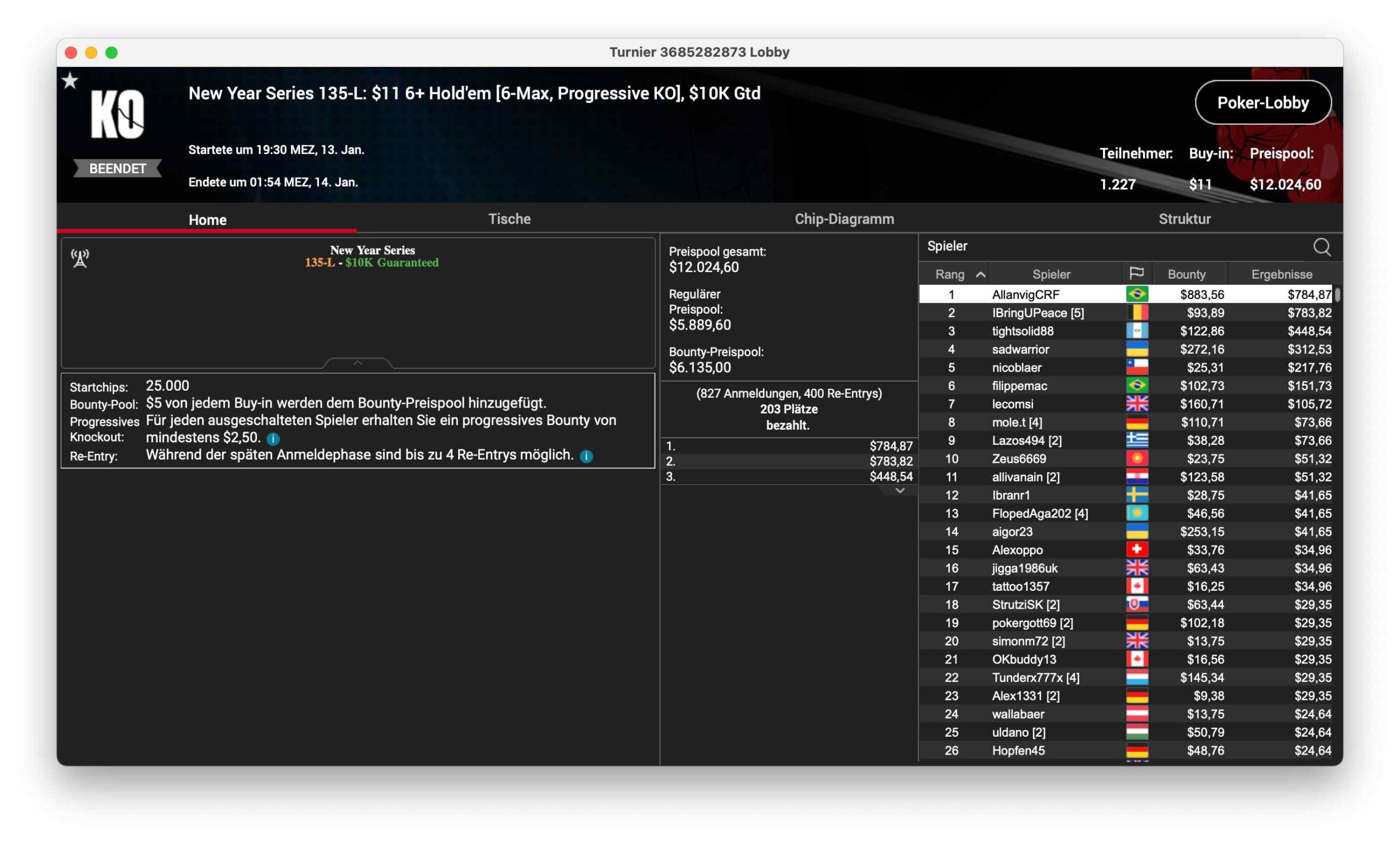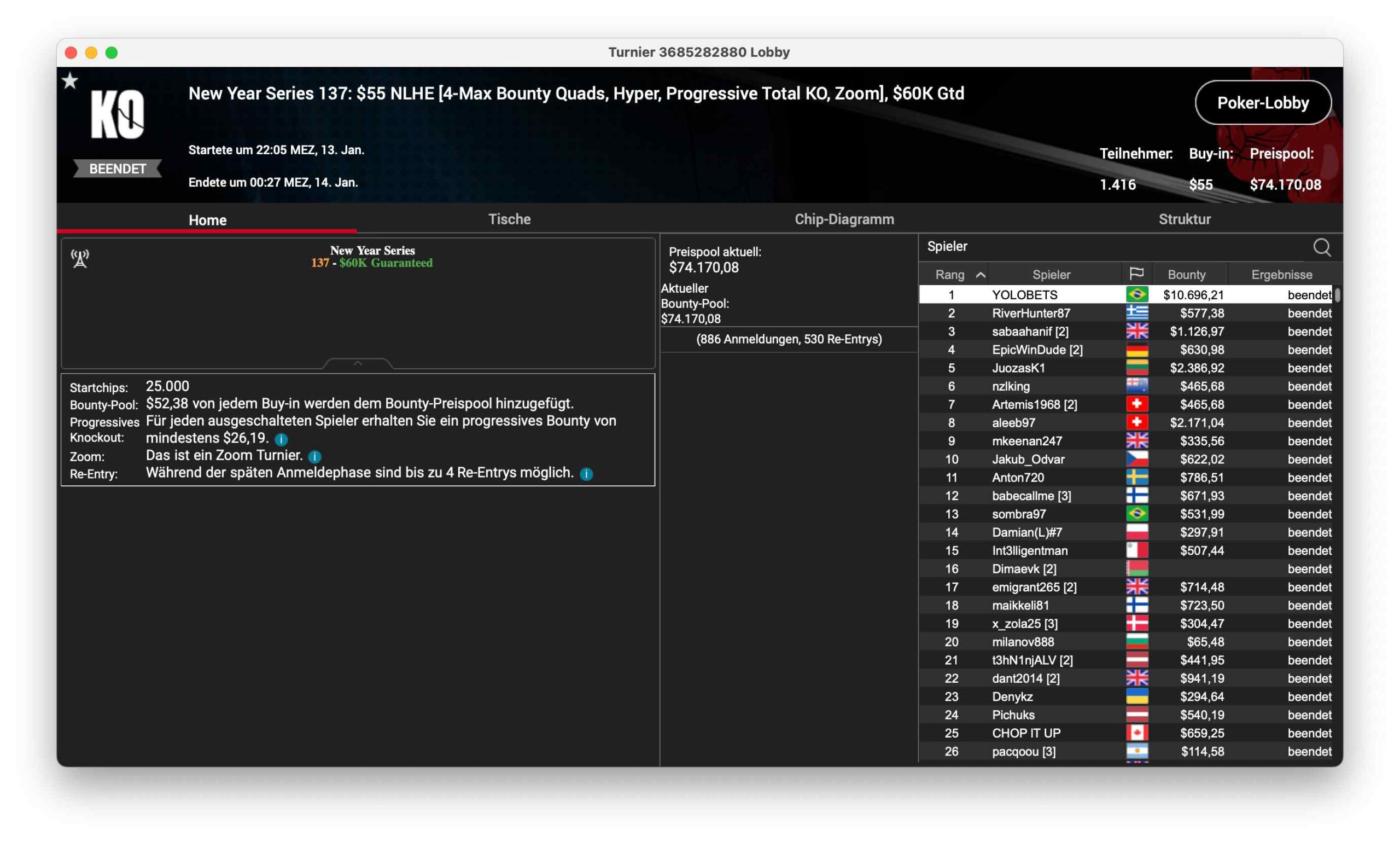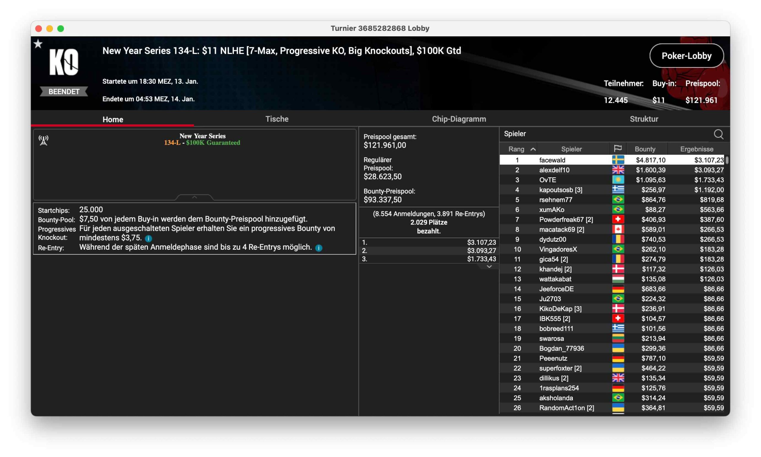 Das größte Turnier der New Year Series war das 134-H, ein $1.050 NLHE PKO Big Knockouts, dort werden $750 aus dem Buy-In zu den Bounties hinzugefügt statt der Hälfte. „Voca94“ aus der Ukraine machte Platz 1 für $30.398 + $6.329.