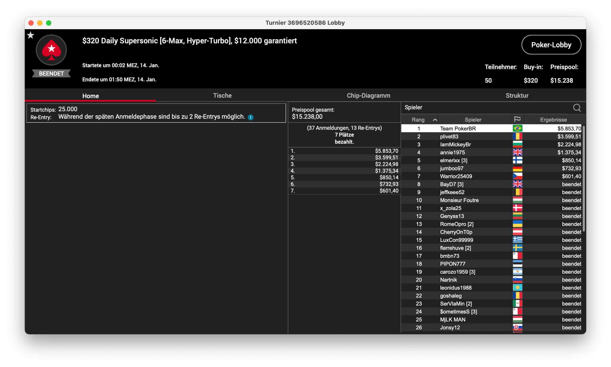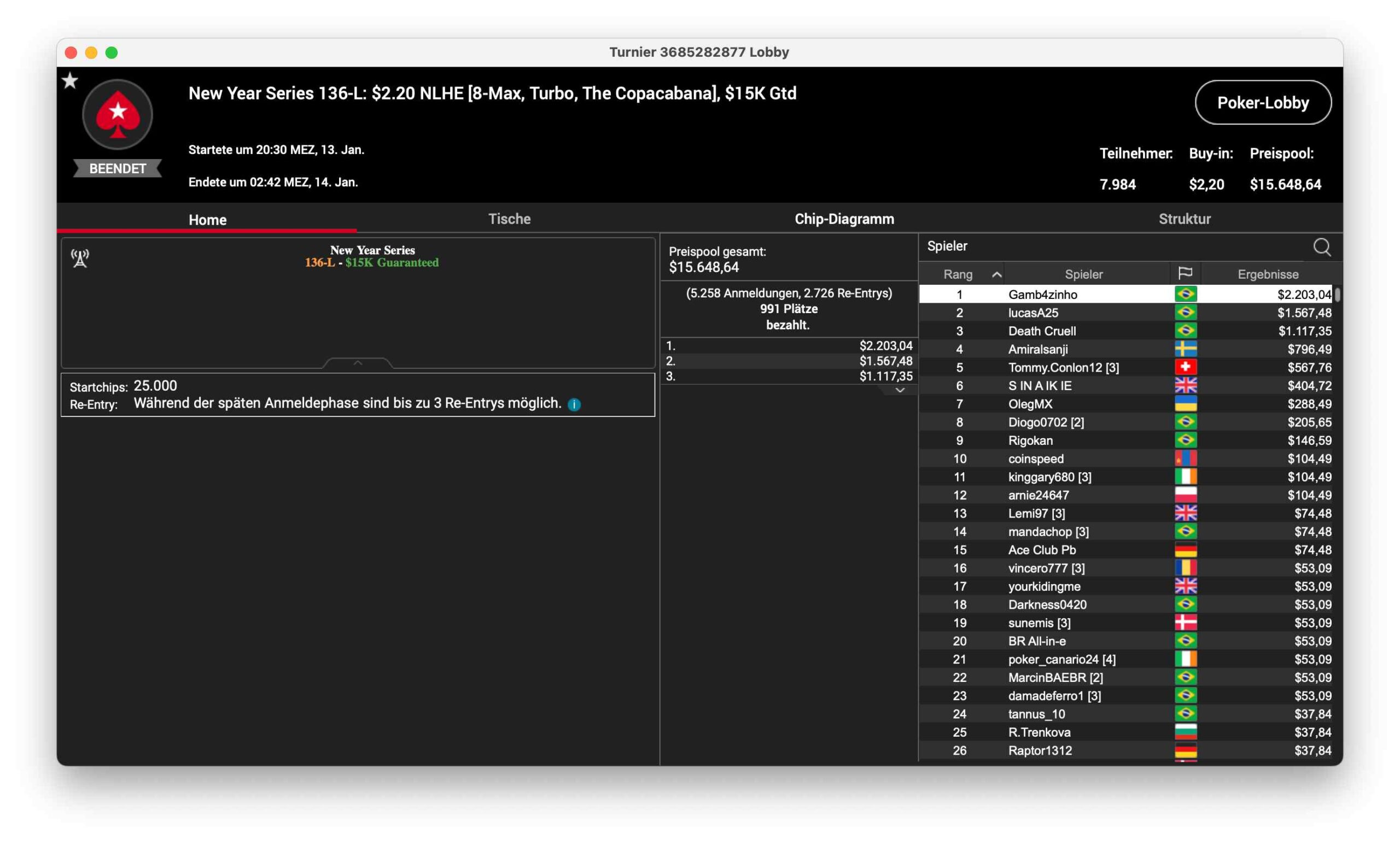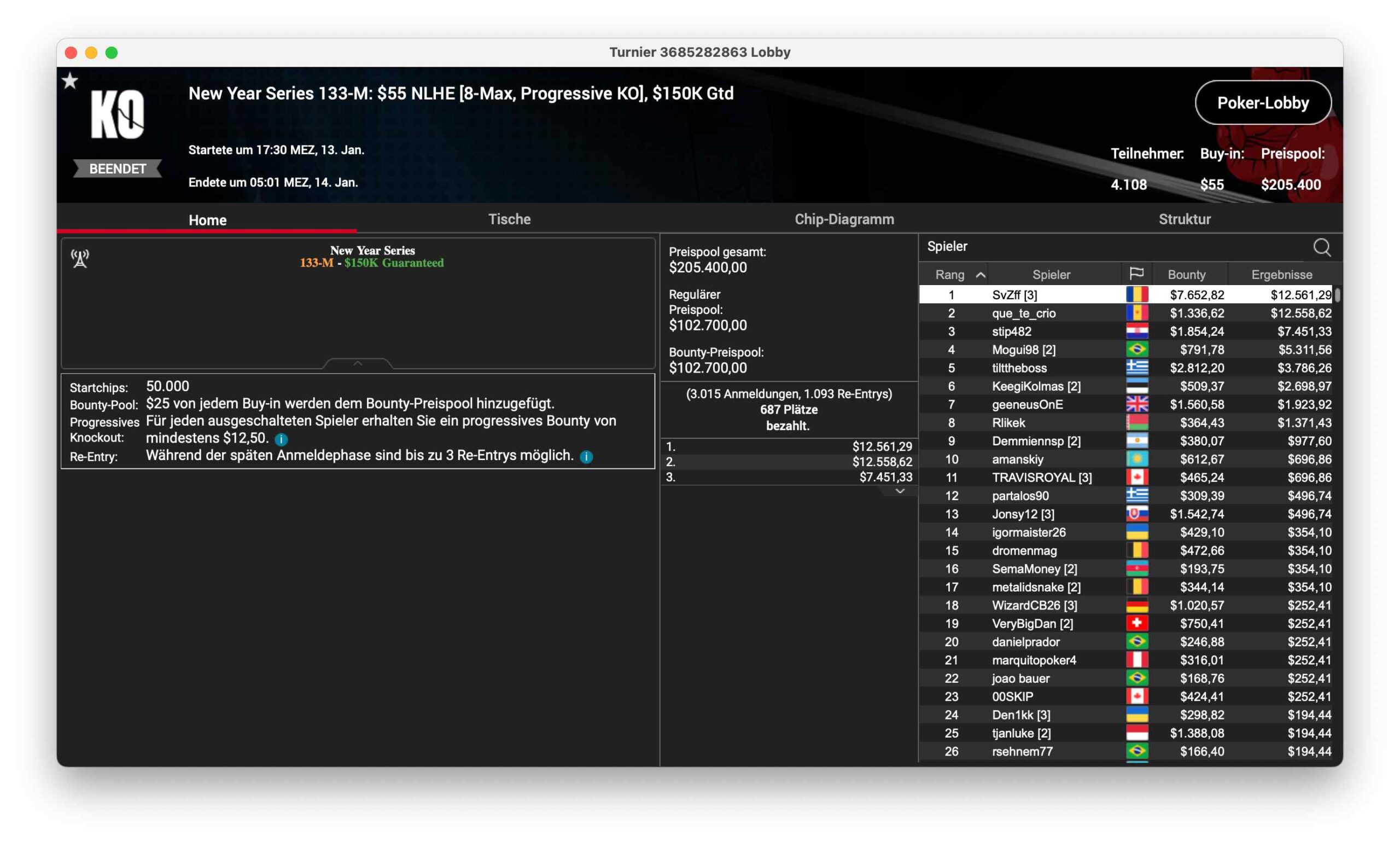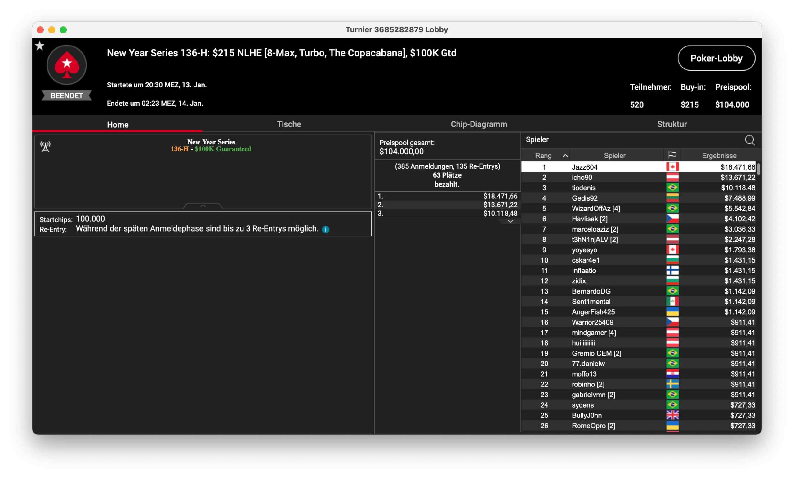Das größte Turnier der New Year Series war das 134-H, ein $1.050 NLHE PKO Big Knockouts, dort werden $750 aus dem Buy-In zu den Bounties hinzugefügt statt der Hälfte. „Voca94“ aus der Ukraine machte Platz 1 für $30.398 + $6.329.