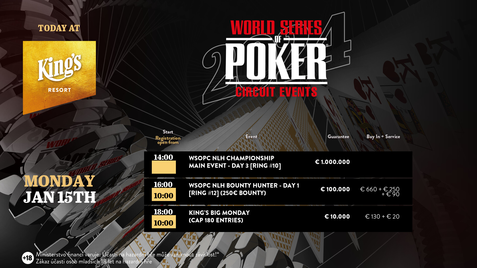 Um 18:00 Uhr gibt es das €130+20 King’s Big Monday – das Turnier hat ein €10.000 Garantie.