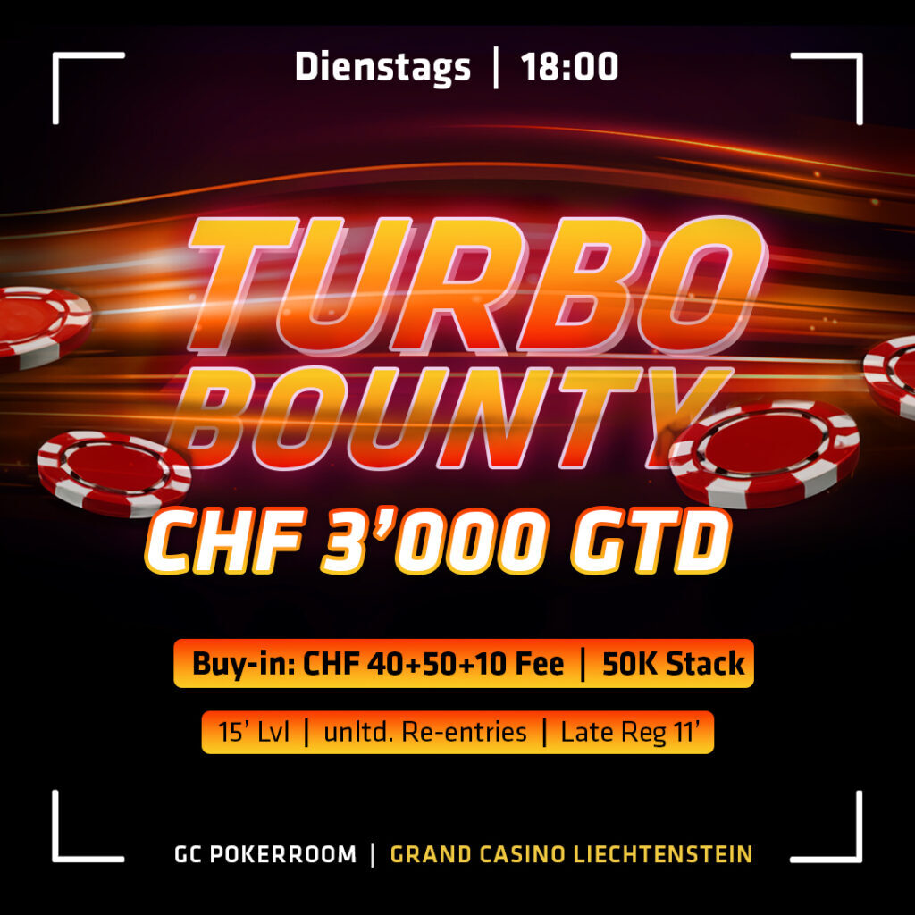 Am Dienstag geht es dann um 18:00 Uhr weiter mit dem CHF 100 Turbo Bounty. Gespielt wird mit einer CHF 3.000 Garantie, einem 50k Start Stack und 15-Minuten Levels.