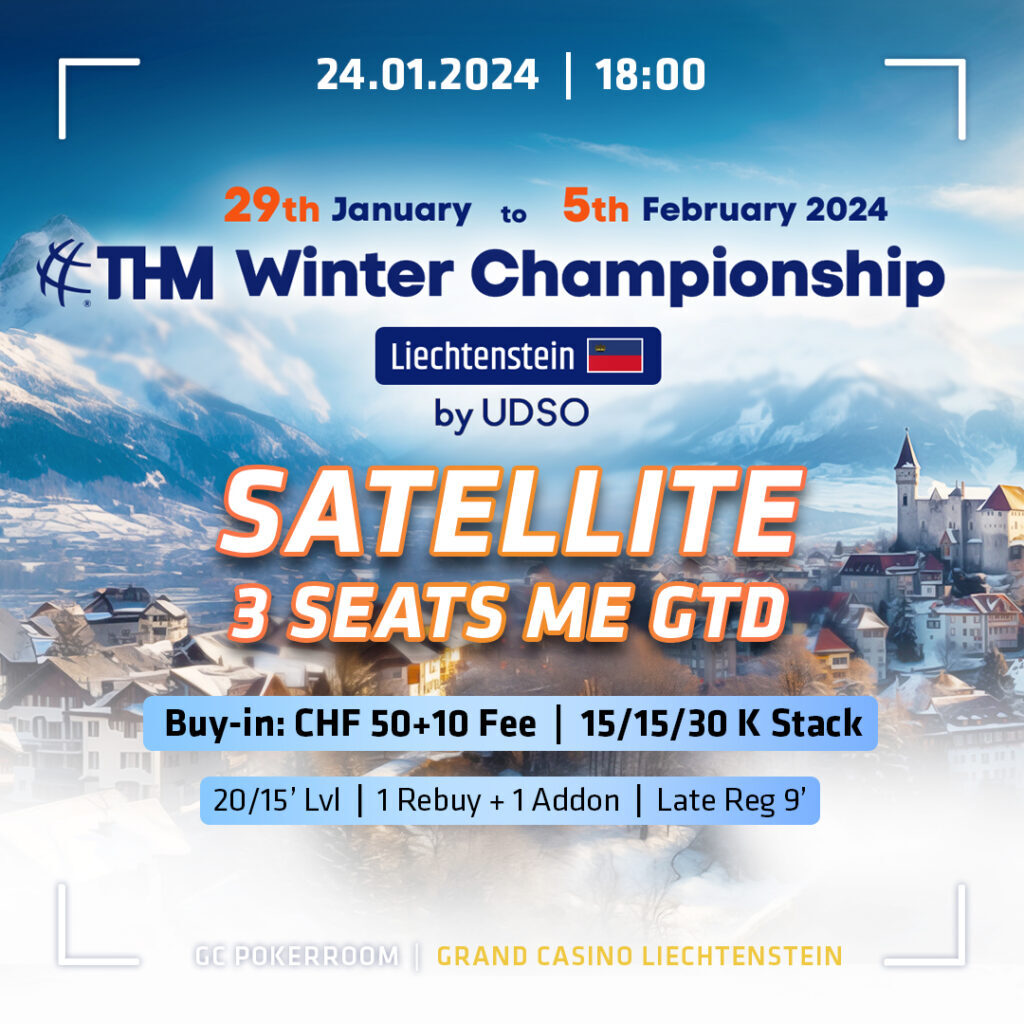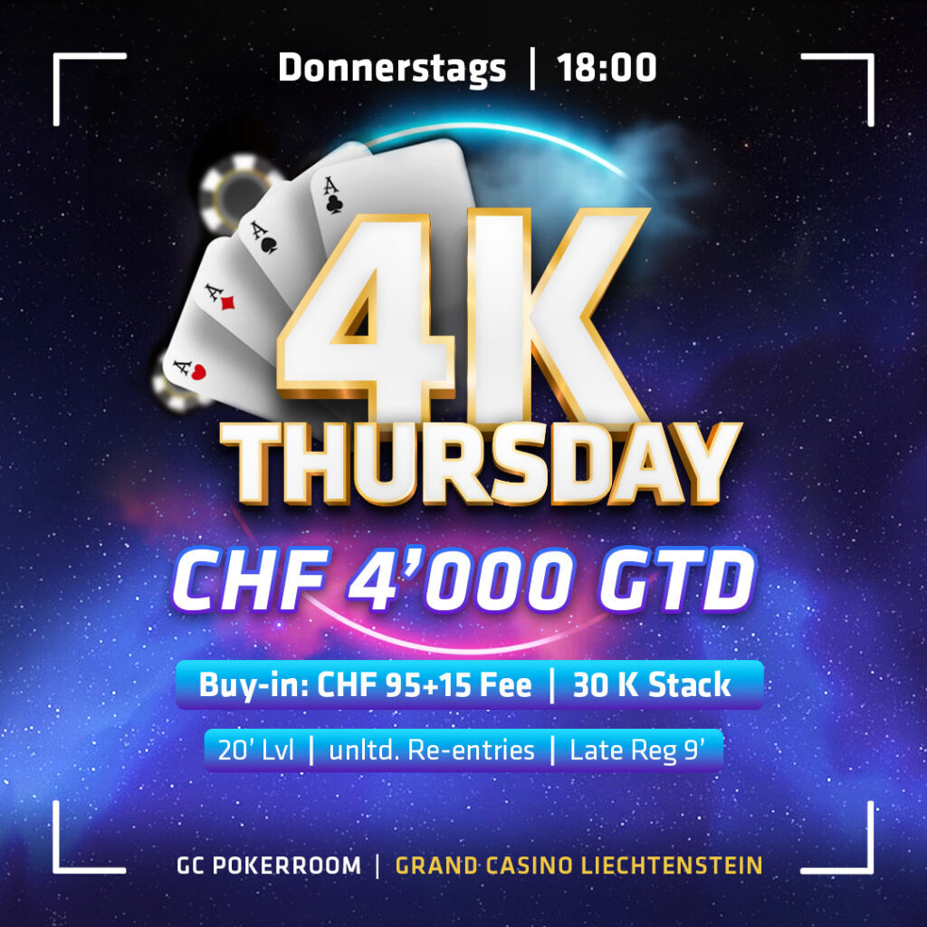 Donnerstags im Grand Casino Liechtenstein heißt immer 4k Thursday. Dies ist ein Turnier mit einer CHF 4.000 Garantie bei einem CHF 110 Buy-in. Es startet um 18:00 Uhr mit einem 30k Stack und läuft mit 20-Minuten Levels.