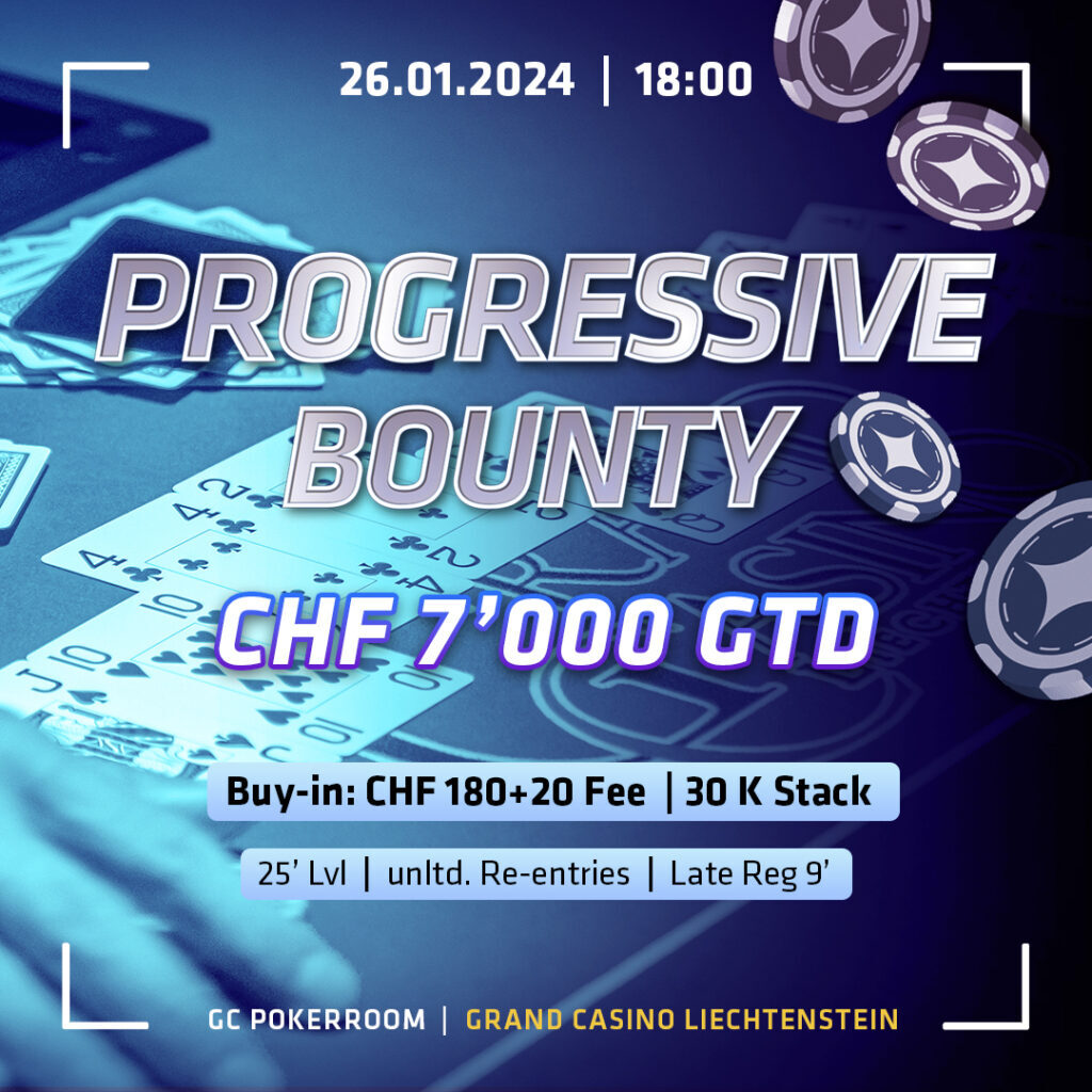 Am Freitag gehen wir auf Kopfgeld-Jagd mit dem CHF 200 Progressive Bounty Turnier. Dieses startet um 18:00 Uhr und ist mit einer CHF 7.000 Garantie versehen. Gespielt wird mit 30k Stack und 25-Minuten Levels.