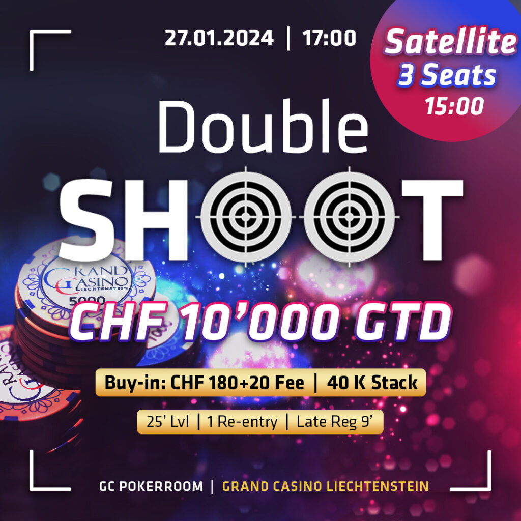 Das CHF 200 Double Shoot wird am Samstag ab 17:00 Uhr angeboten. Das Turnier hat eine CHF 10.000 Garantie, einen 40k Start Stack und 25-Minuten Blinds. Wer etwas günstiger an diesem Turnier teilnehmen möchte, hat die Chance, sich um 15:00 Uhr in einem CHF 35 Satellite mit drei garantierten Seats zu qualifizieren.