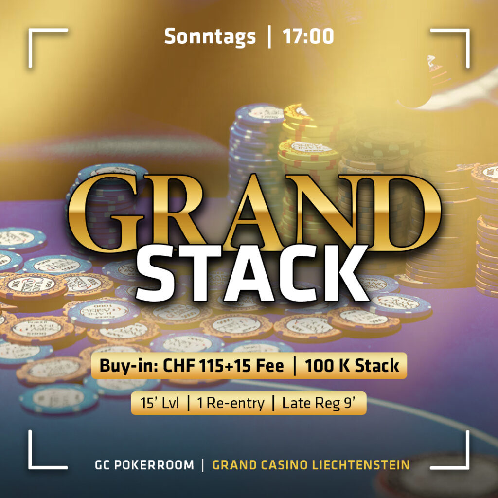 Und zum Abschluss gibt es sonntags immer das CHF 130 Grand Stack. Hier geht es um 17:00 Uhr los mit einem 100k Stack und 15-Minuten Levels.