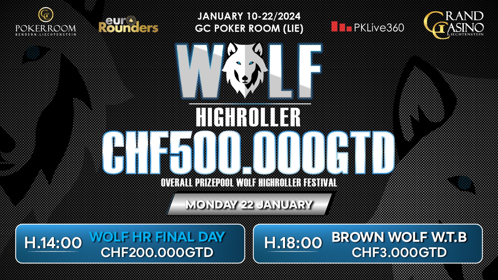 Das „Wolf Poker Highroller“ powered by euroRounders im Grand Casino Liechtenstein (GCLI) wird heute seinen Abschluss finden. Gestern waren noch das CHF 500 Wolf Deep und das CHF 150 Grey Wolf im Angebot, aber der Fokus lag auf dem Tag 2 des CHF 1.100 Wolf High Rollers (CHF 200k GTD).