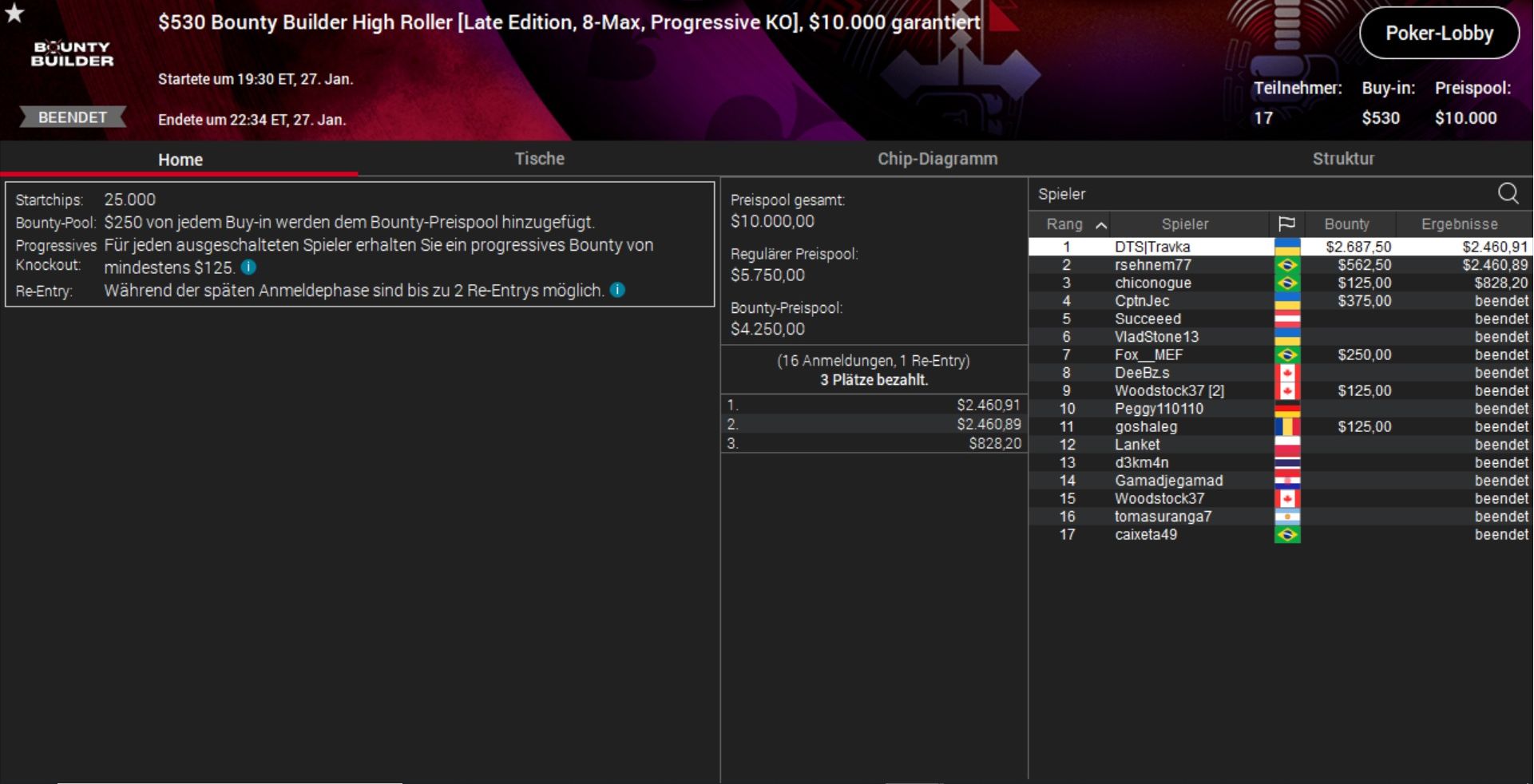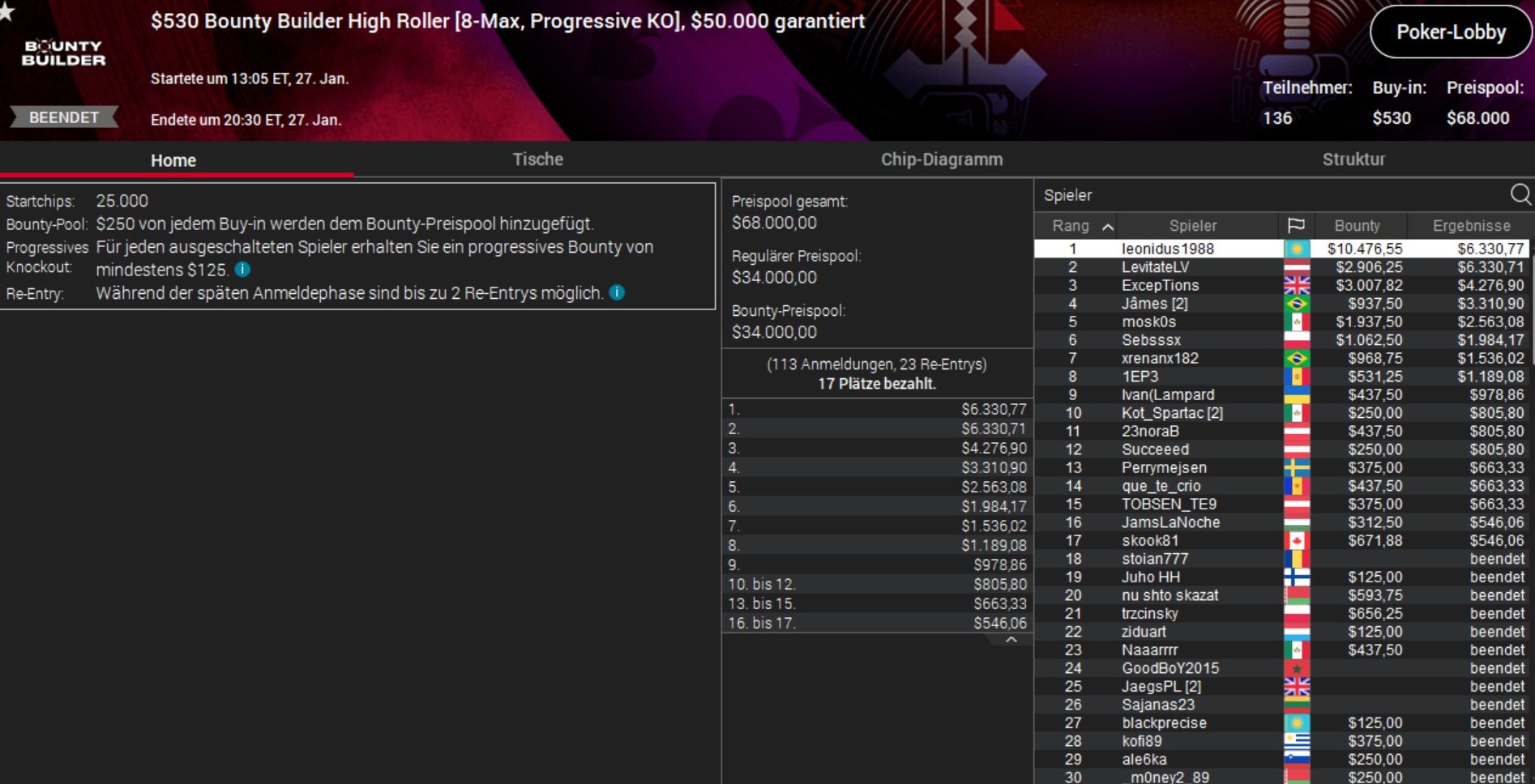 Einzig beim $530 Bounty Builder gab es für Rang 12 unter 136 Startern Kohle und mit gut $1.000 Preisgeld das doppelte Buy-In zurück.