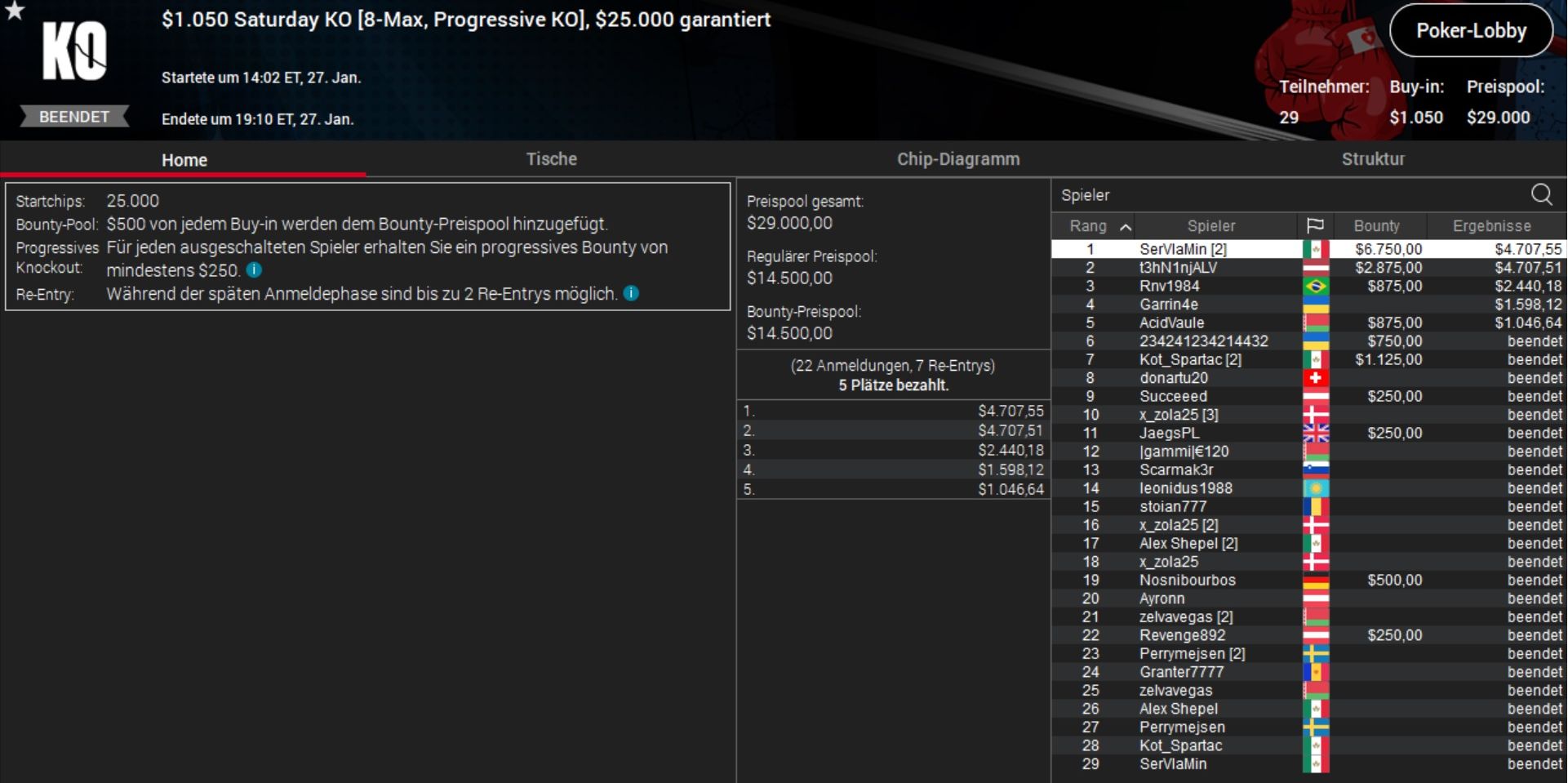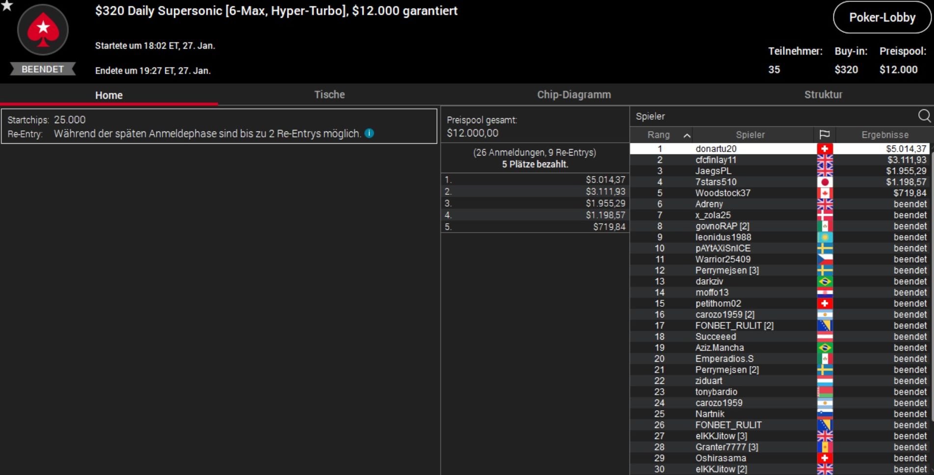 Besser lief es für den Schweizer „donartu20“. Er ließ beim $320 Supersonic alle 34 Konkurrenten hinter sich und kassierte gut $5.000 Preisgeld. Dazu kam ein vierter Platz beim $530 Cooldown, der immerhin weitere knapp $700 einbrachte.