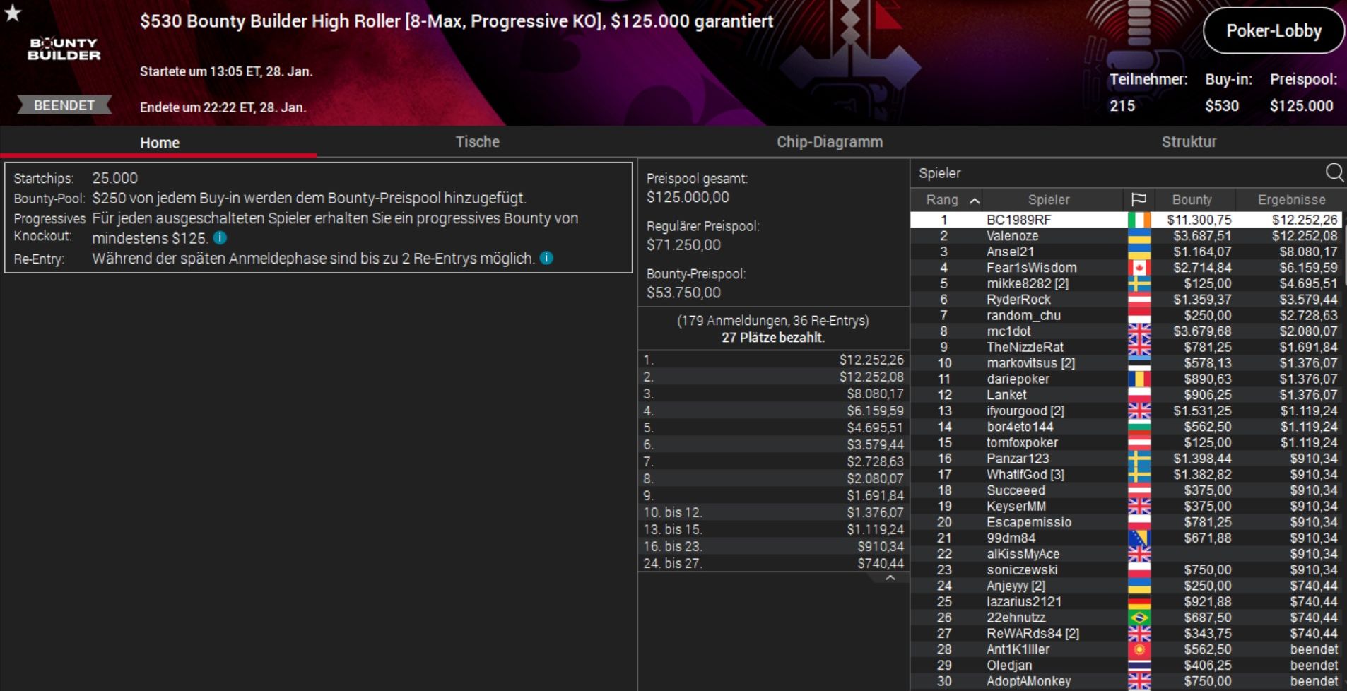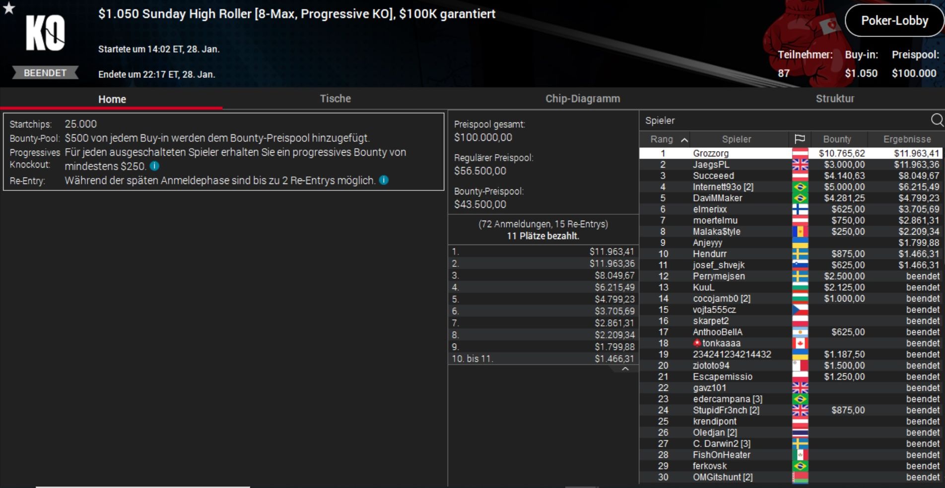 Für den einzigen deutschen Sieg sorgte Leonard „grozzorg“ Maue. Er ließ beim $1.050 Sunday High Roller 86 Konkurrenten hinter sich und kassierte rund $23.000 Preisgeld.