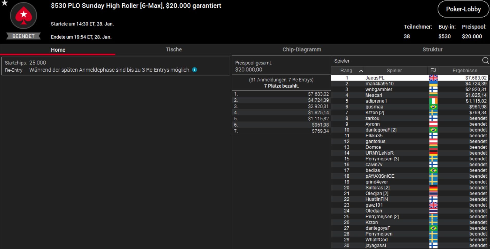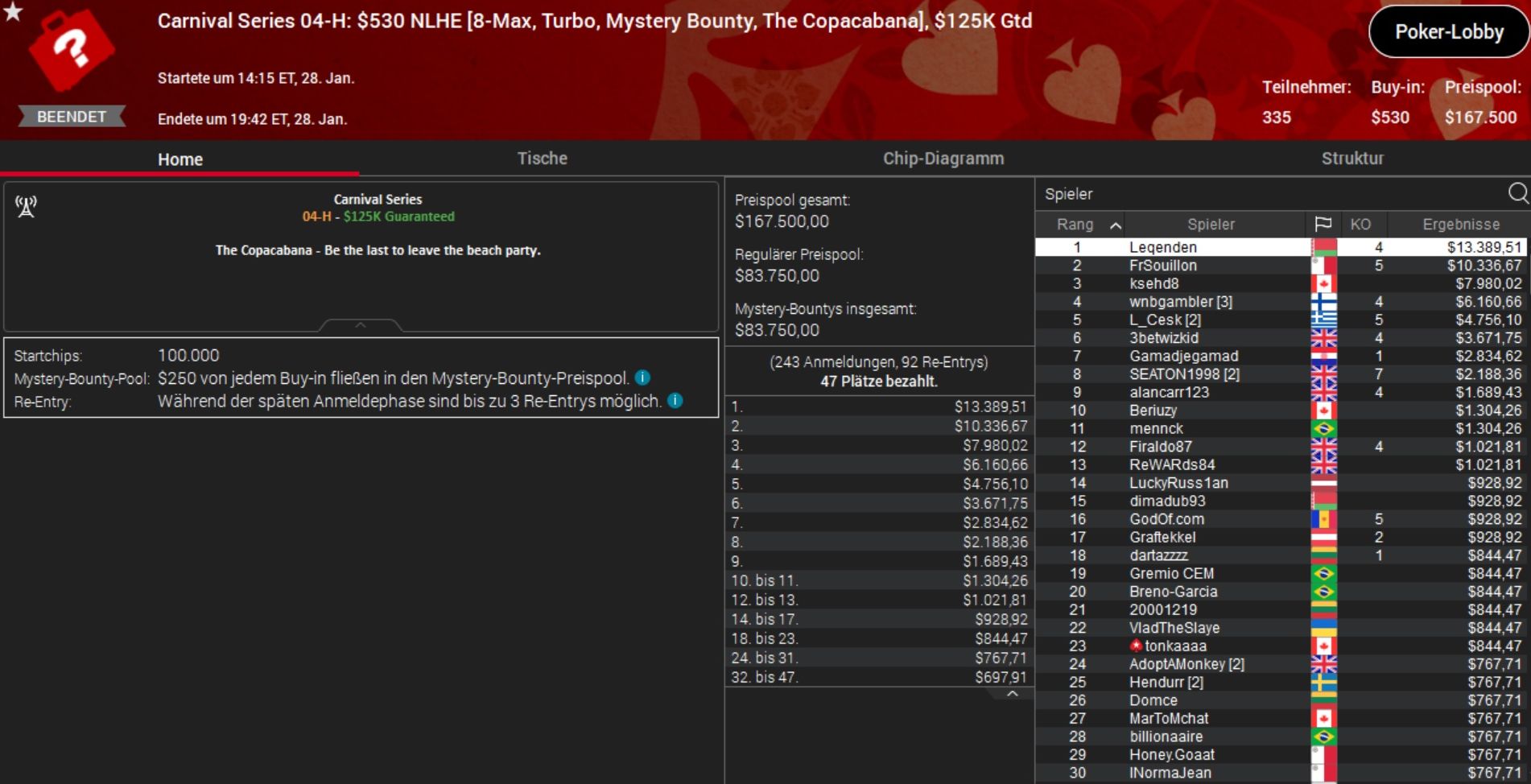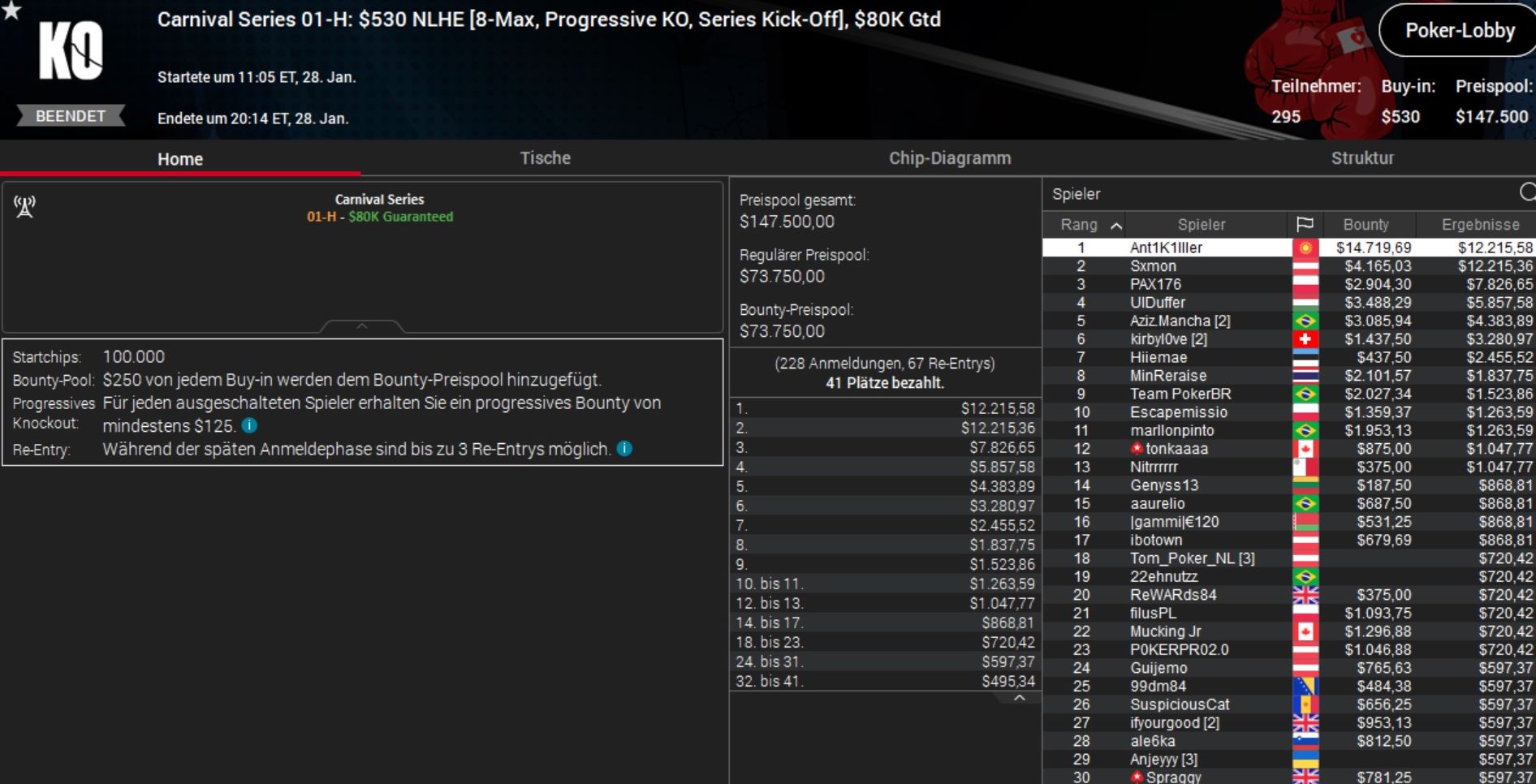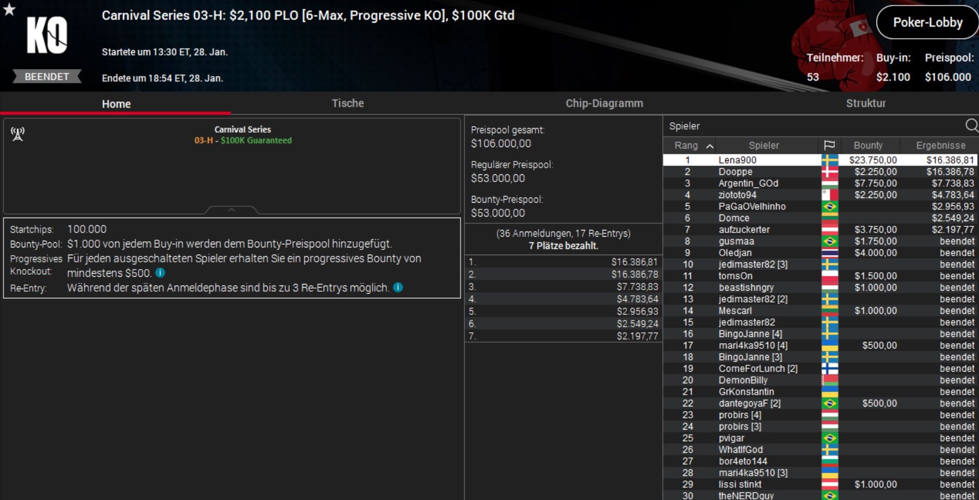 Siege gab es am Sonntag auf für internationale Topstars wie Niklas „Lena900“ Astedt (Carnival Series 3), Ramiro „ramastar88“ Petrone (Supersonic) und Patrick „JaegsPL“ Lauber (PLO Sunday High Roller).