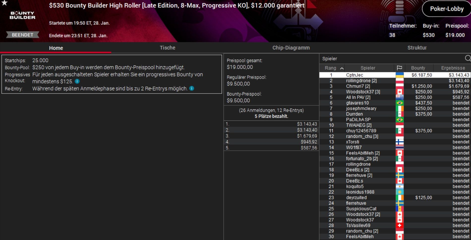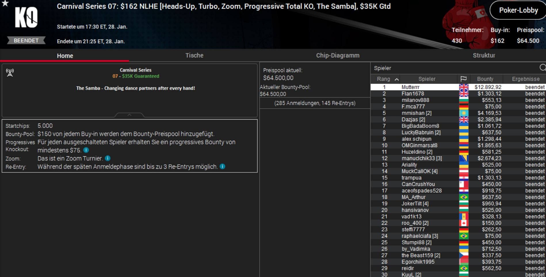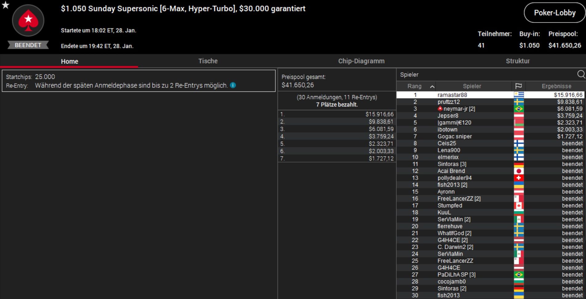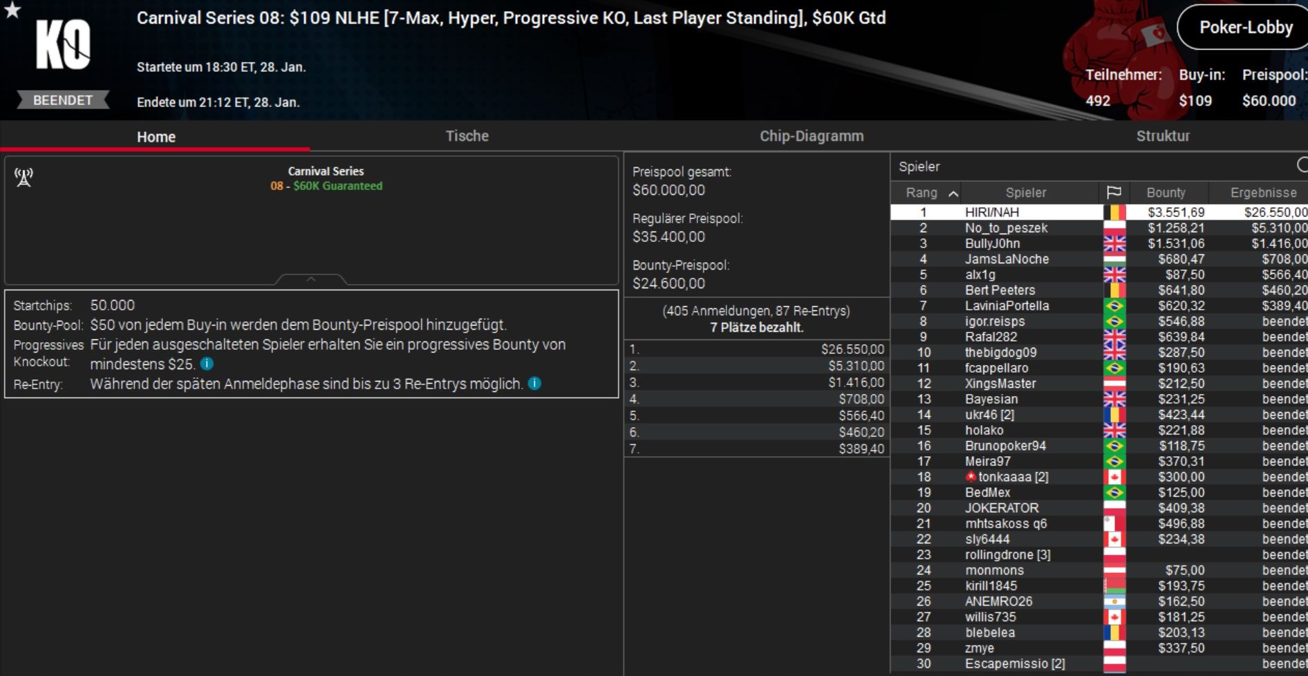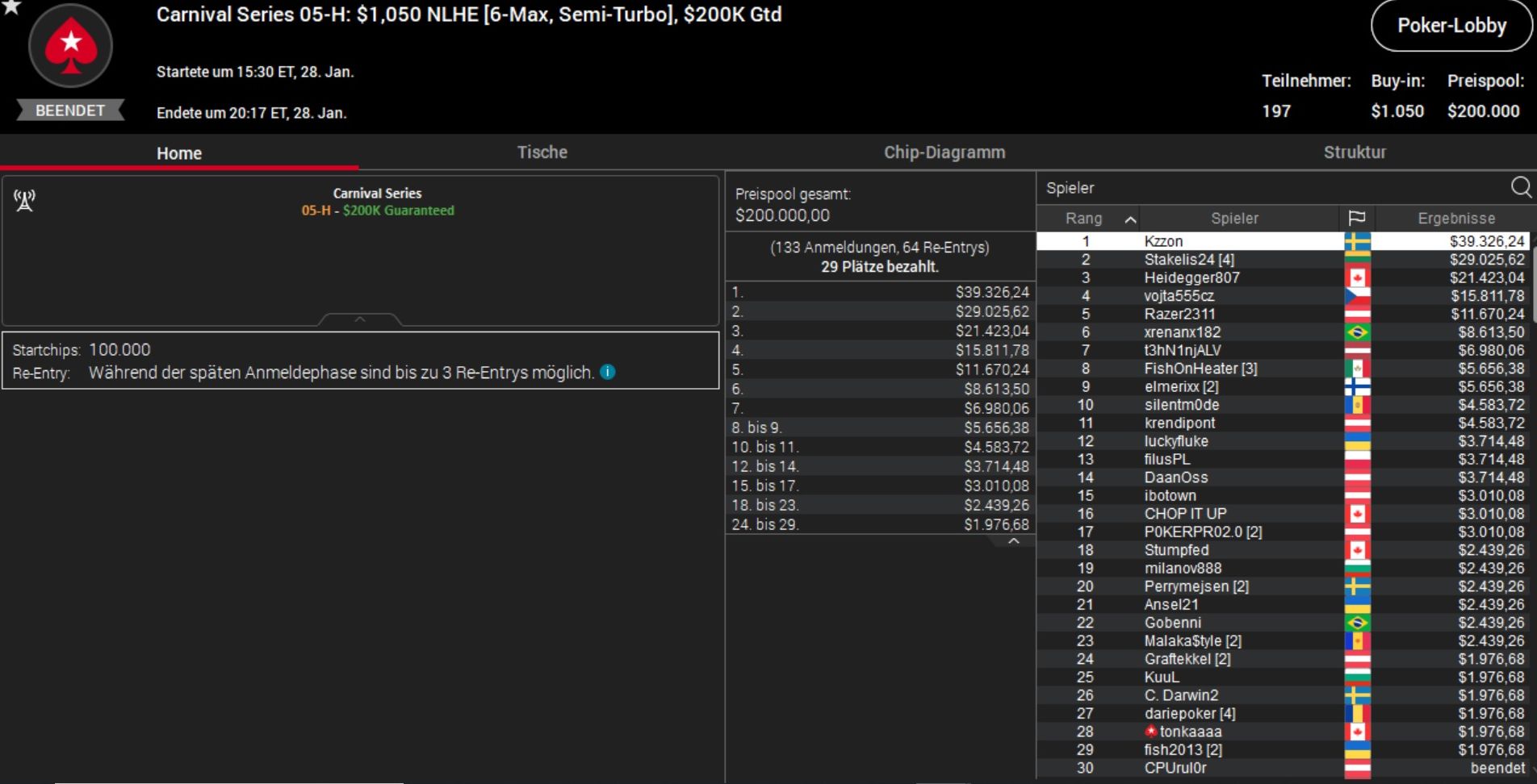 Siege gab es am Sonntag auf für internationale Topstars wie Niklas „Lena900“ Astedt (Carnival Series 3), Ramiro „ramastar88“ Petrone (Supersonic) und Patrick „JaegsPL“ Lauber (PLO Sunday High Roller).