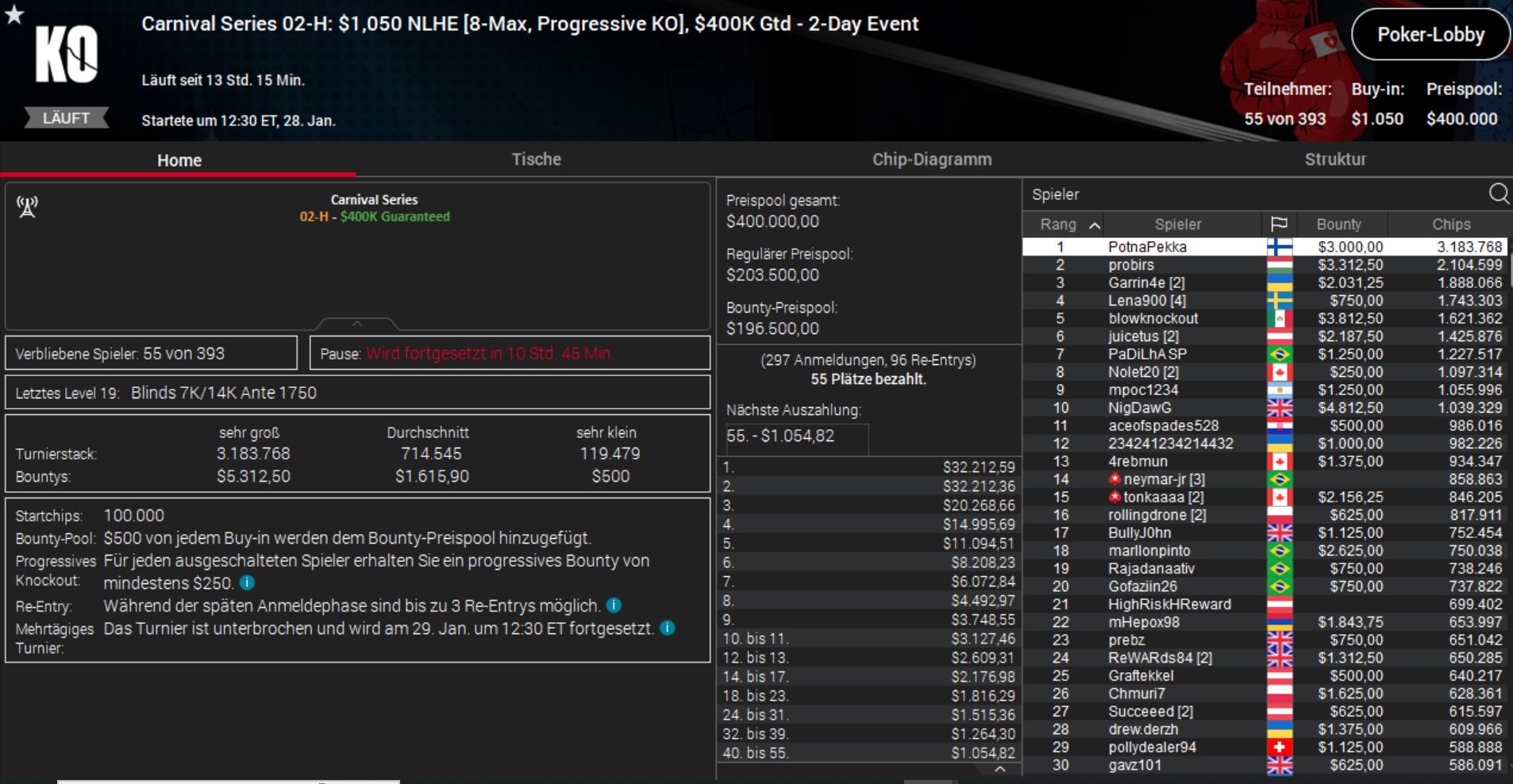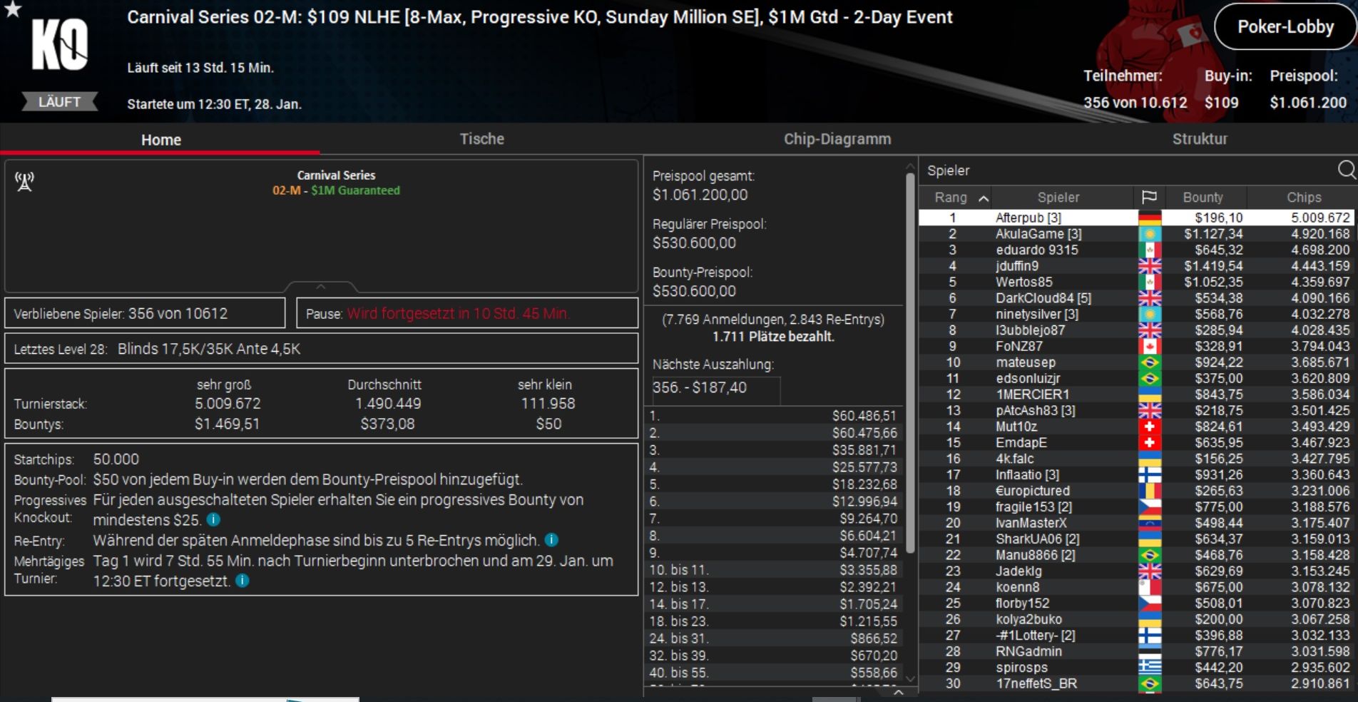 Wie üblich auf zwei Tage angesetzt ist die Sunday Million, die dieses Wochenende als Event 2-H der Carnival Series verpackt ist. Hier führt nach Tag 1 der deutsche Spieler „Afterpub“ und führt die 356 verbliebenen Spieler ins heutige Finale.
