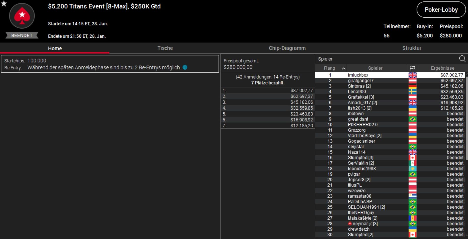 Viele Topstars fanden sich zum $5.200 Titans Event ein, das sich Michael „imluckbox“ Addamo samt einer Siegprämie von gut $87.000 vor dem in Österreich lebenden Belgier Bert „girafganger7“ Stevens sicherte.