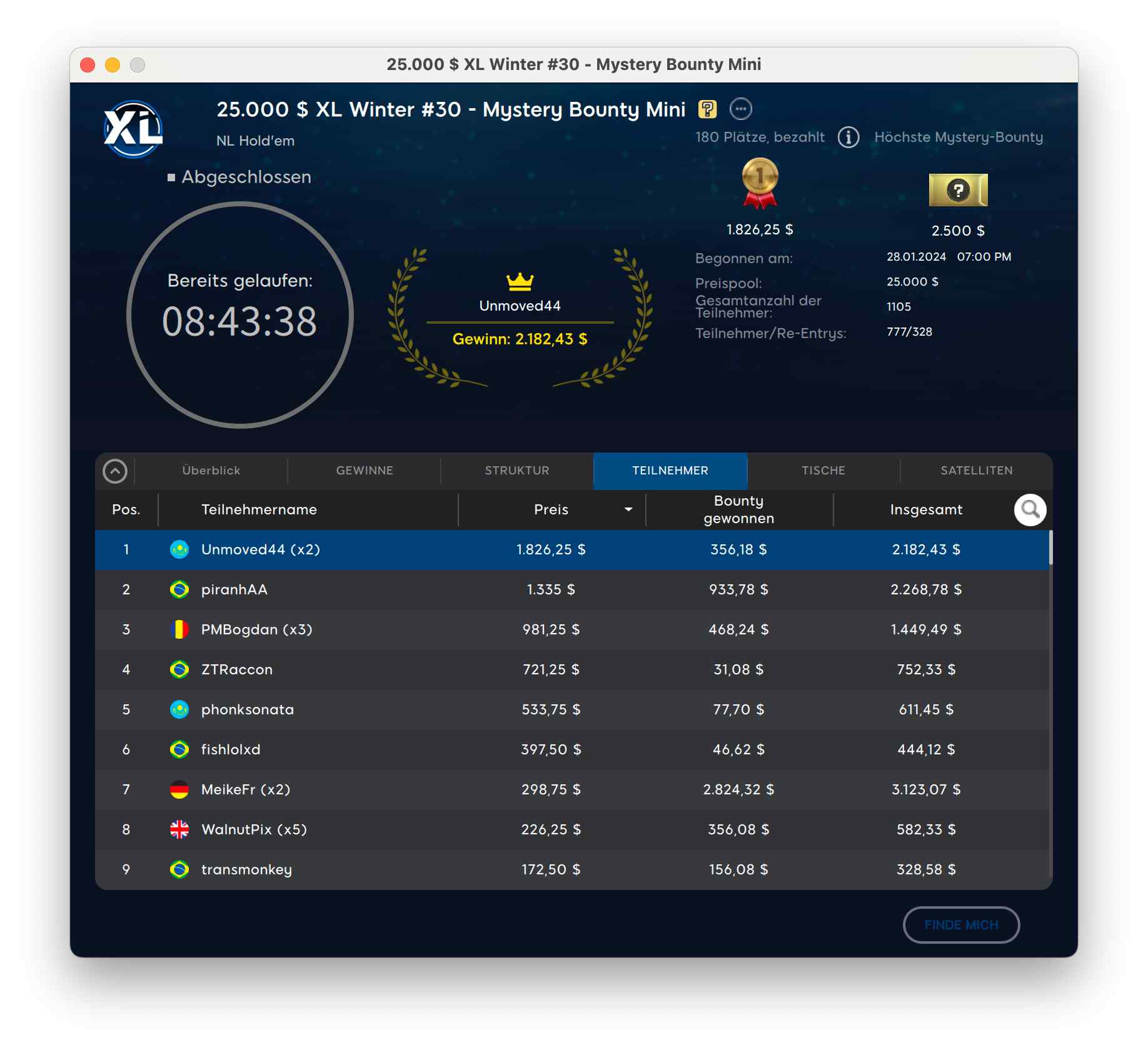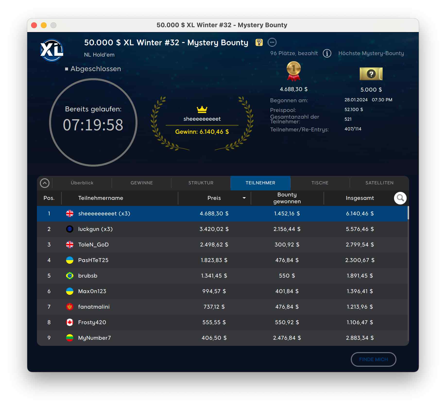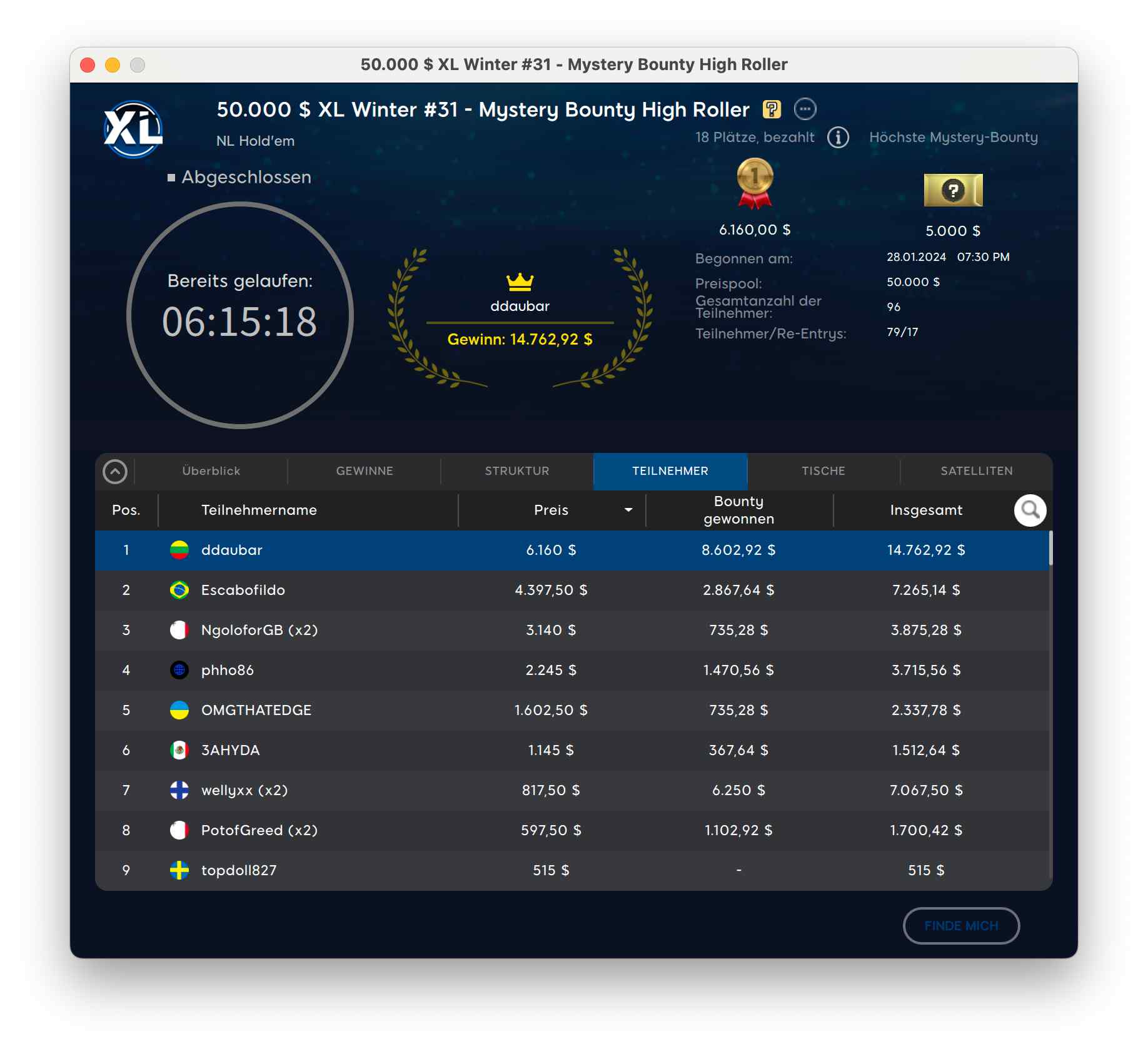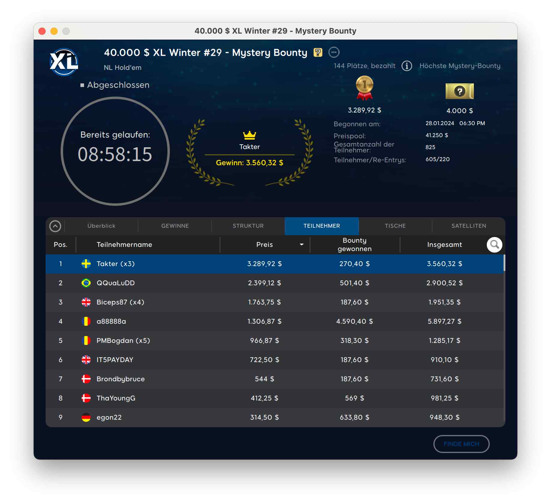 „Takter“ aus Schweden konnte das $50+5 Mystery Bounty holen. $3.289 + $270 gab es hier für den Sieg. $41.250 lagen hier durch 8235 Entries im Preispool.