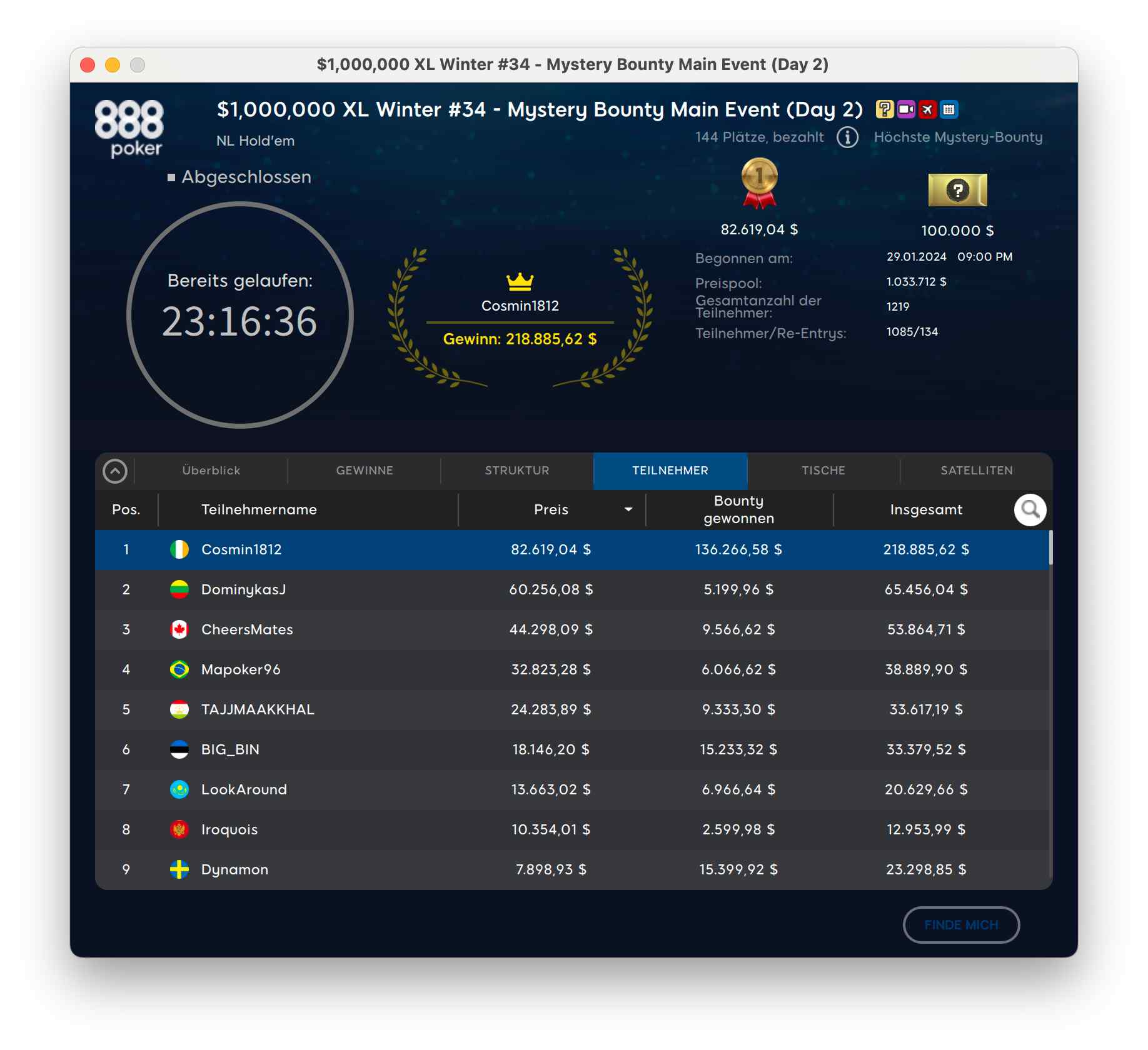 „Cosmin1812“, der aus zweiter Position in die Entscheidung ging, hatte den Lauf seines Lebens. Er konnte direkt zum Start des Final Table seinen Gegner „Iroquois“ mit Damen gegen Jungen vom Tisch nehmen – und das $100.000 Bounty einsacken.